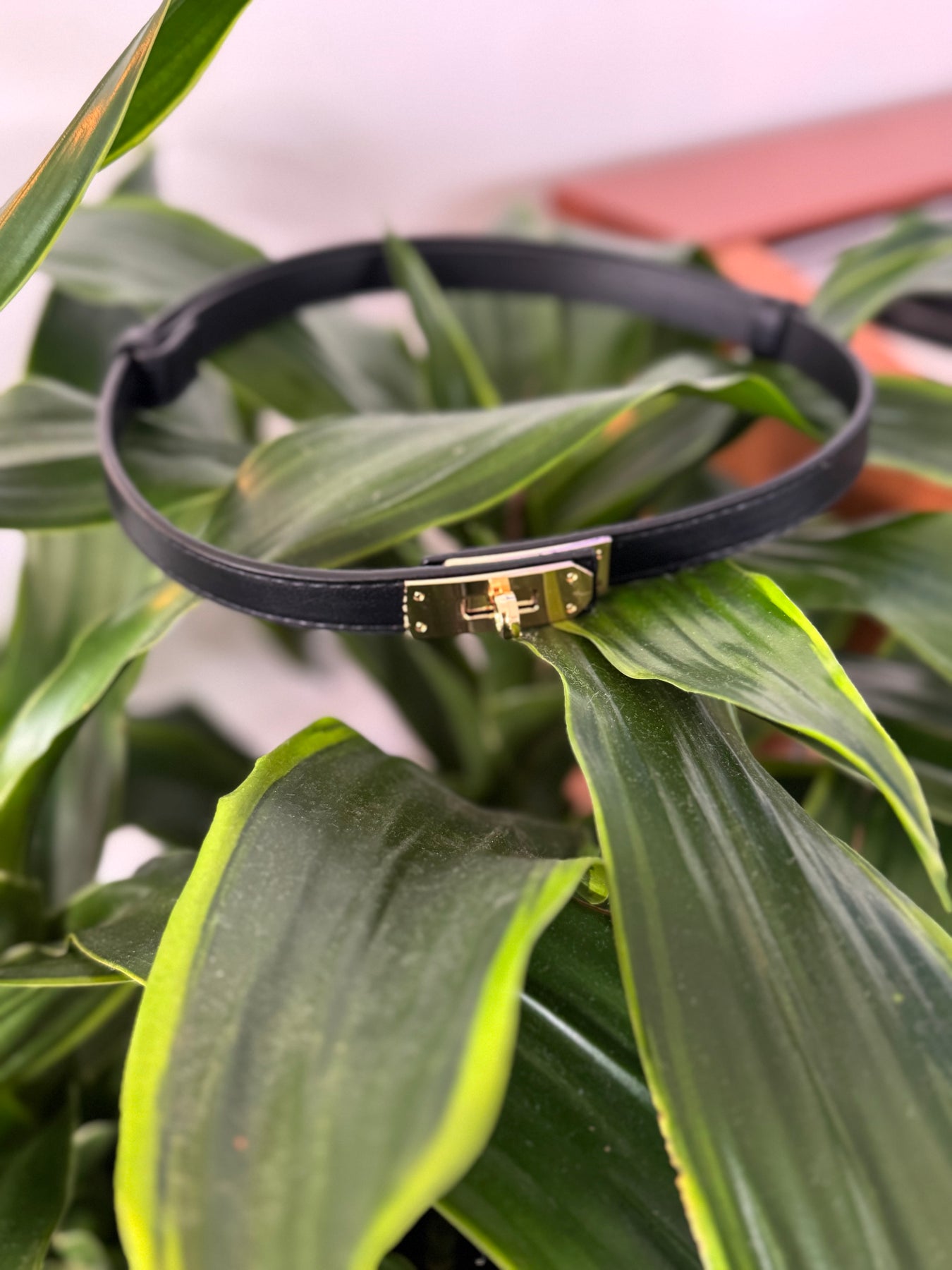 This gorgeous belt changes sizes by sliding into place fitting a variety of sizes. Vegan leather gold tone hardware.