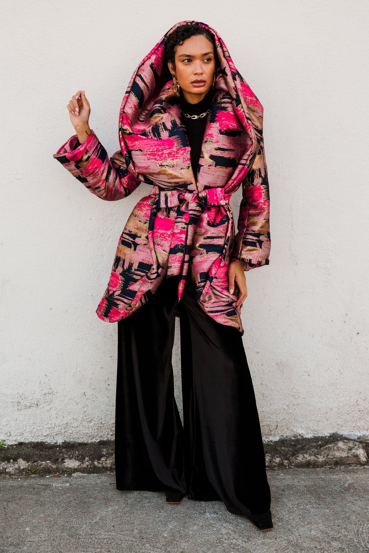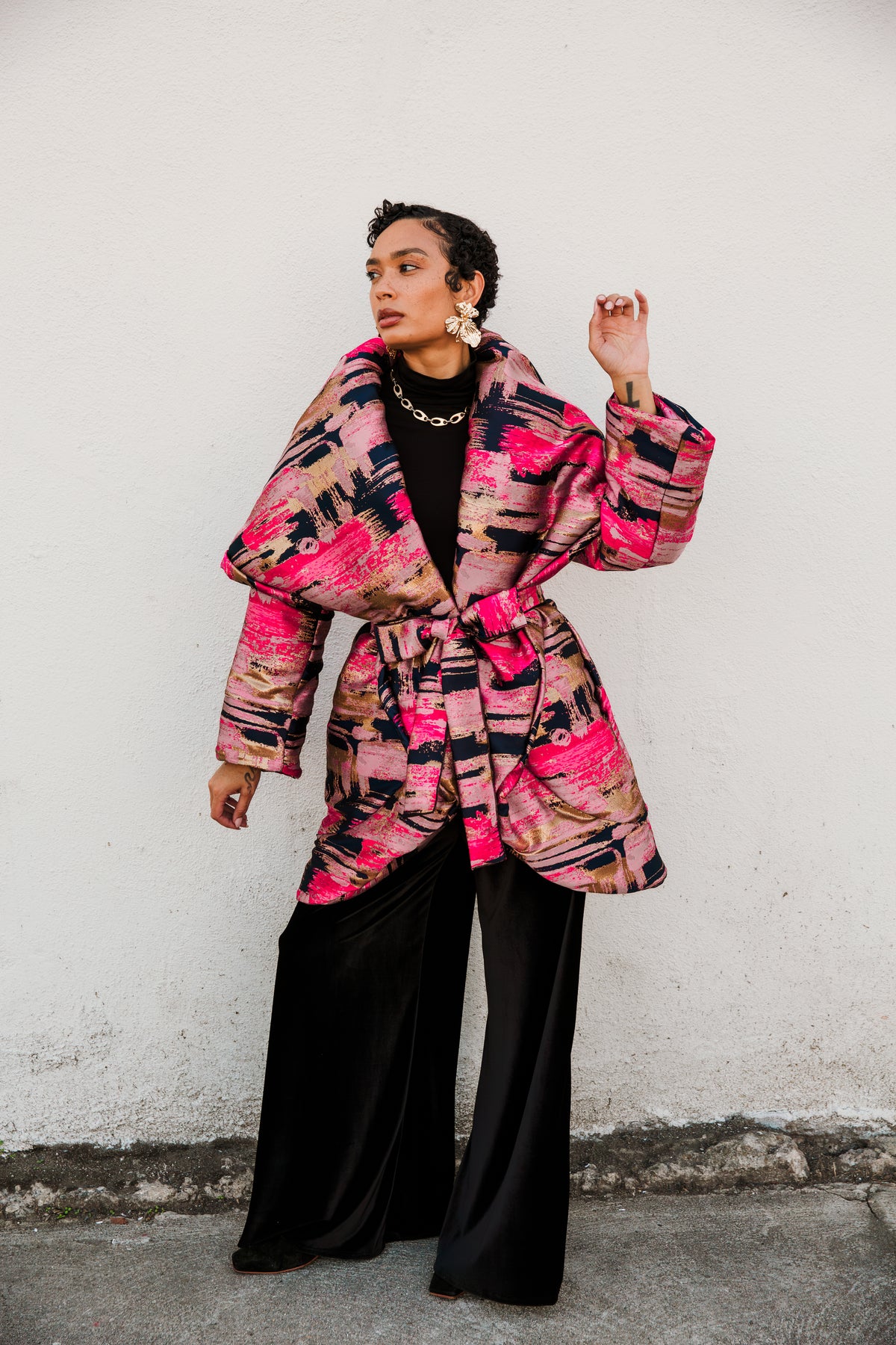 - byVINNIK Cocoon Coat in Premium Jacquard (contains metallic) premium Satin Poly-filled quilted lining