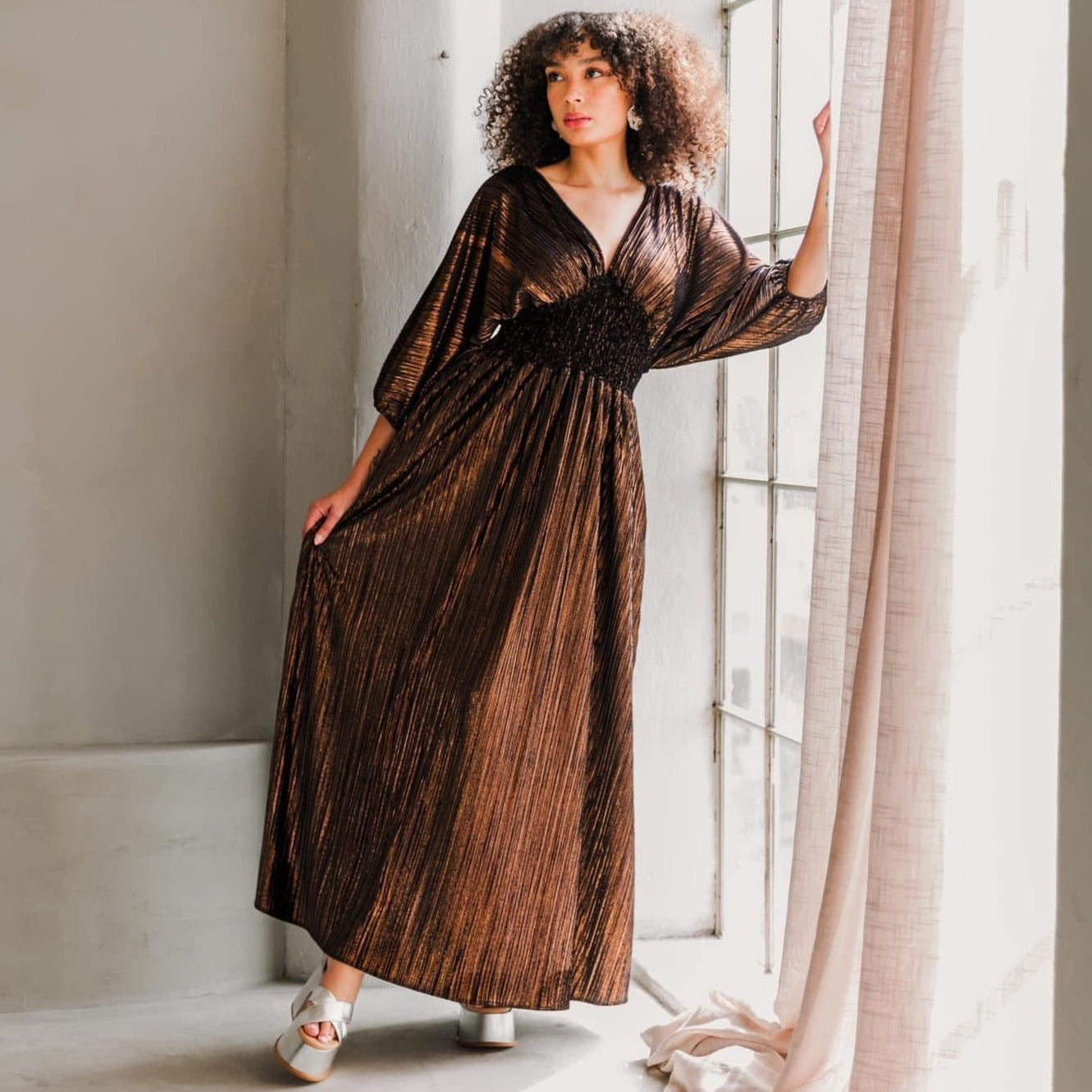 You'll love the plunging v-neck of this gorgeous kaftan-style dress with a beautiful full skirt, shirred elasticized waist, and crescent moon-shaped dolman sleeves. Pop it on with your denim jacket, fluffy faux furries, and more in cold weather - or wear it as is in hot temps! You’ll love the v-neck front and back that allows this dress to be worn by so many different shapes and sizes. We’ve fully lined this gorgeous dress, making it a perfect all-season dress. She’s a timeless new icon!