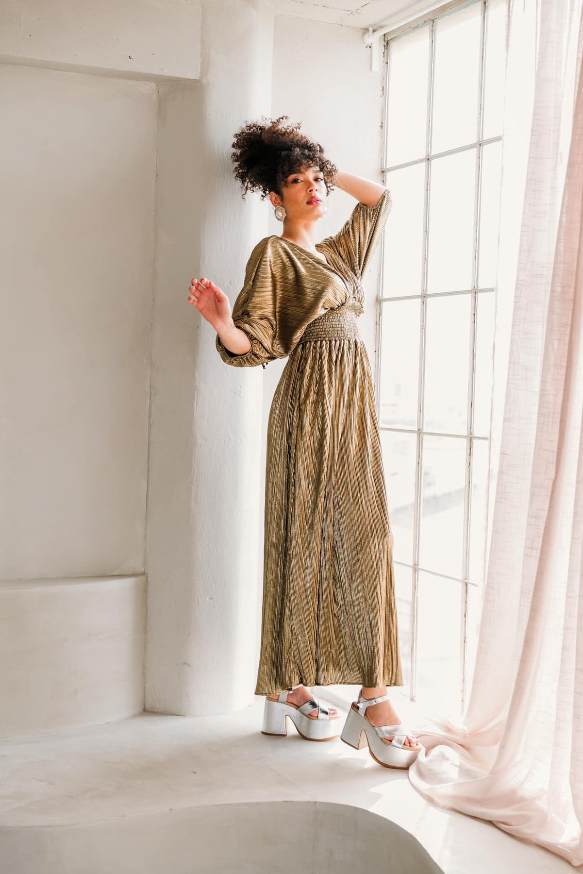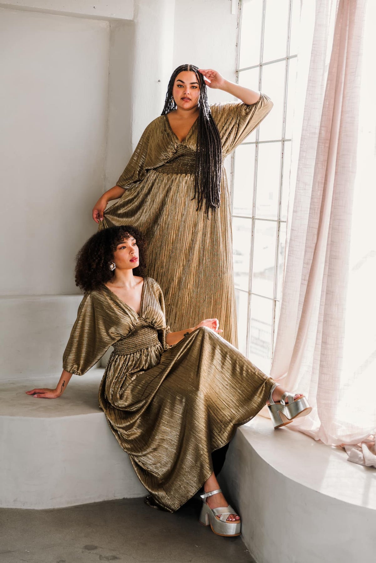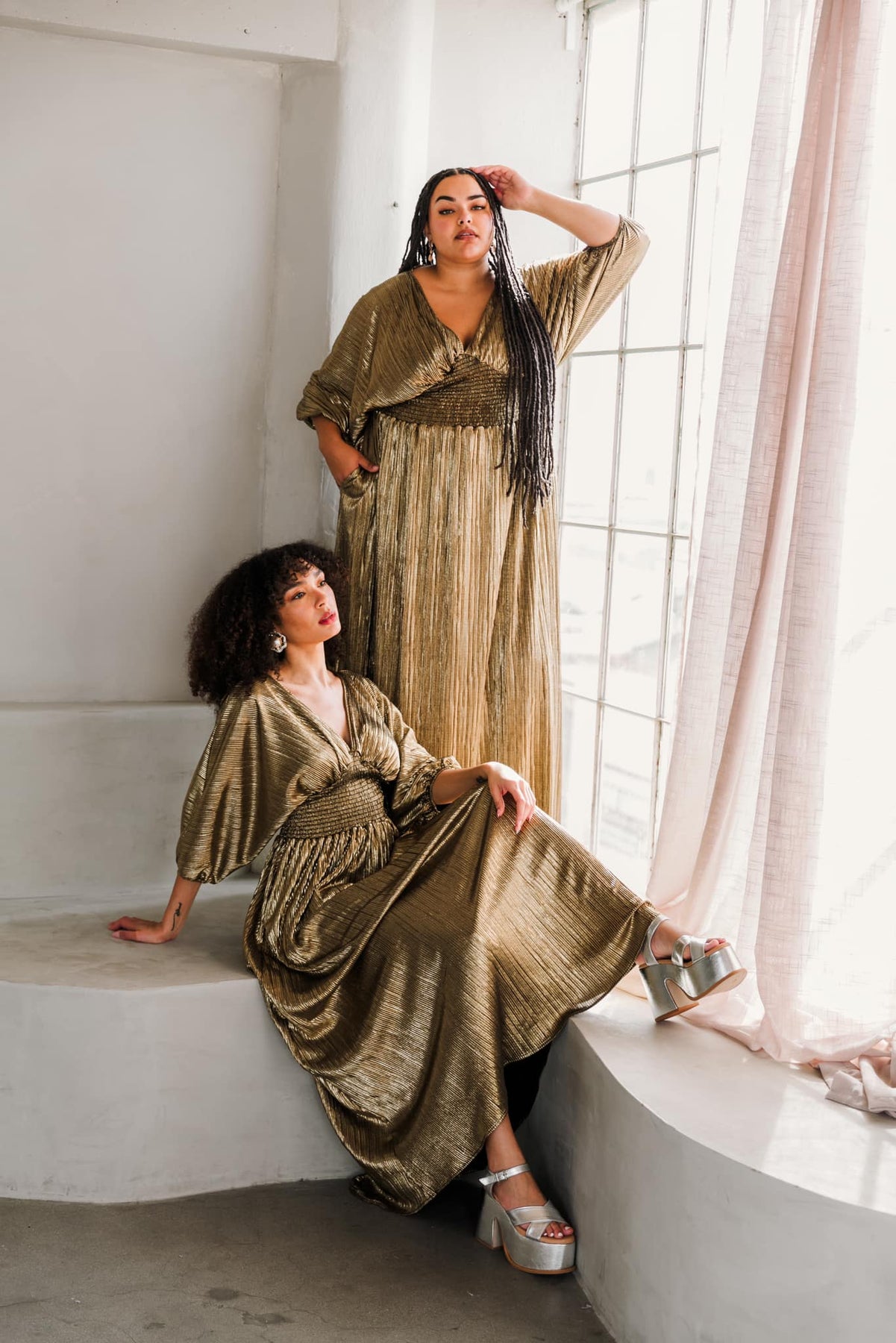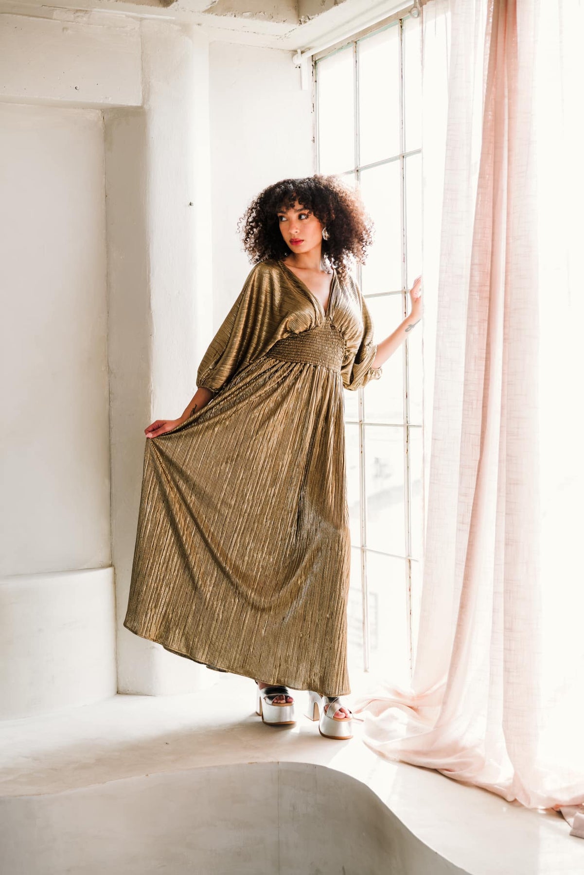 You'll love the plunging v-neck of this gorgeous kaftan-style dress with a beautiful full skirt, shirred elasticized waist, and crescent moon-shaped dolman sleeves. Pop it on with your denim jacket, fluffy faux furries, and more in cold weather - or wear it as is in hot temps! You’ll love the v-neck front and back that allows this dress to be worn by so many different shapes and sizes. We’ve fully lined this gorgeous dress, making it a perfect all-season dress. She’s a timeless new icon!