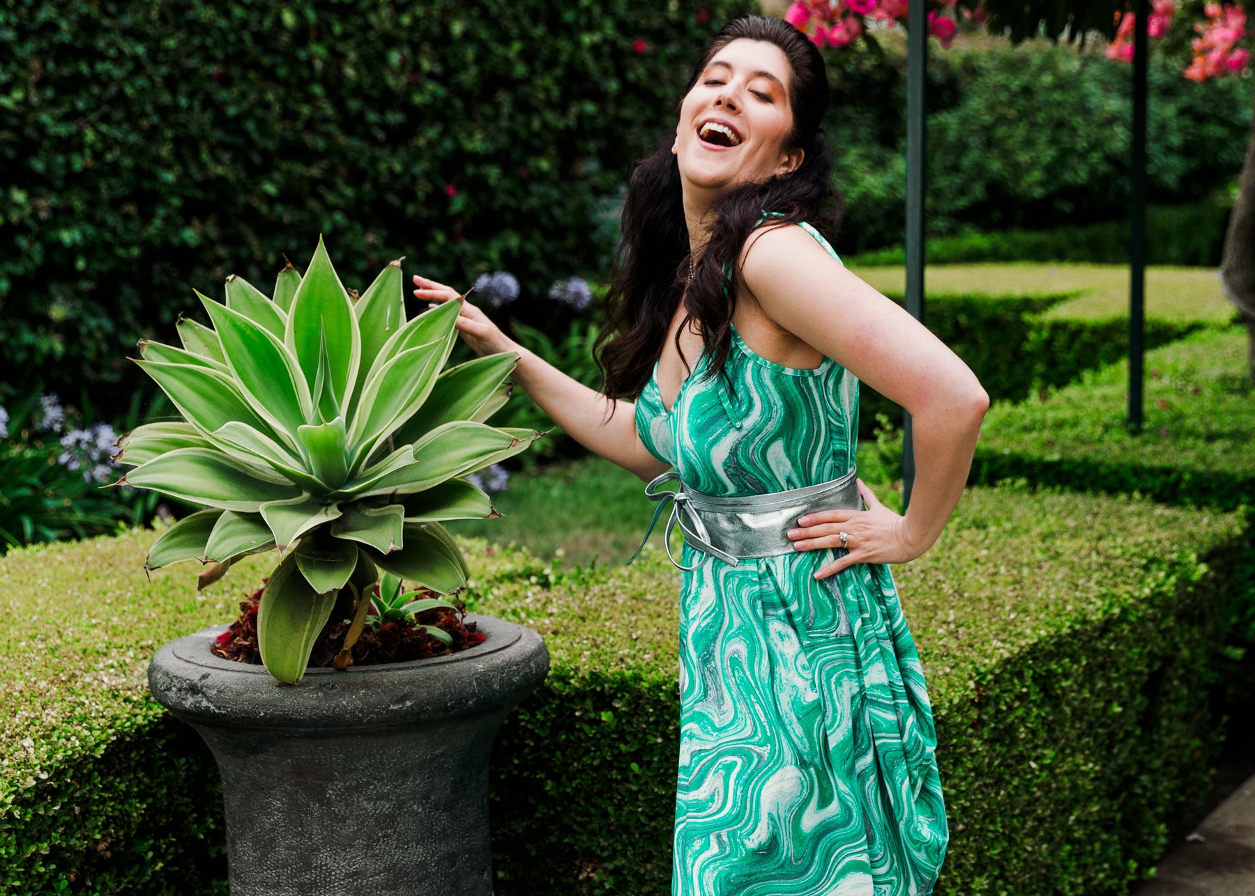 Woman in a green dress standing next to a potted plant in an outdoor setting