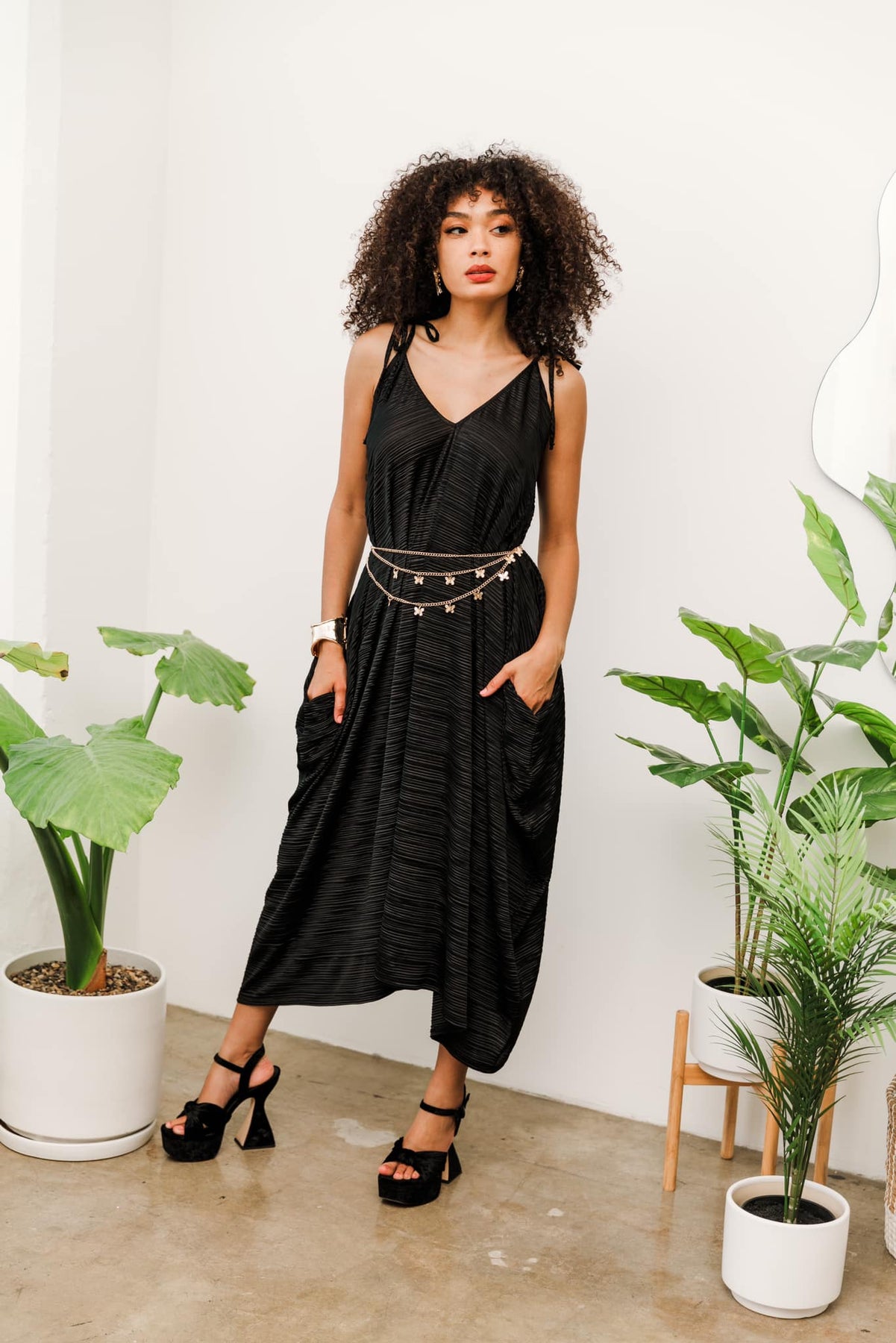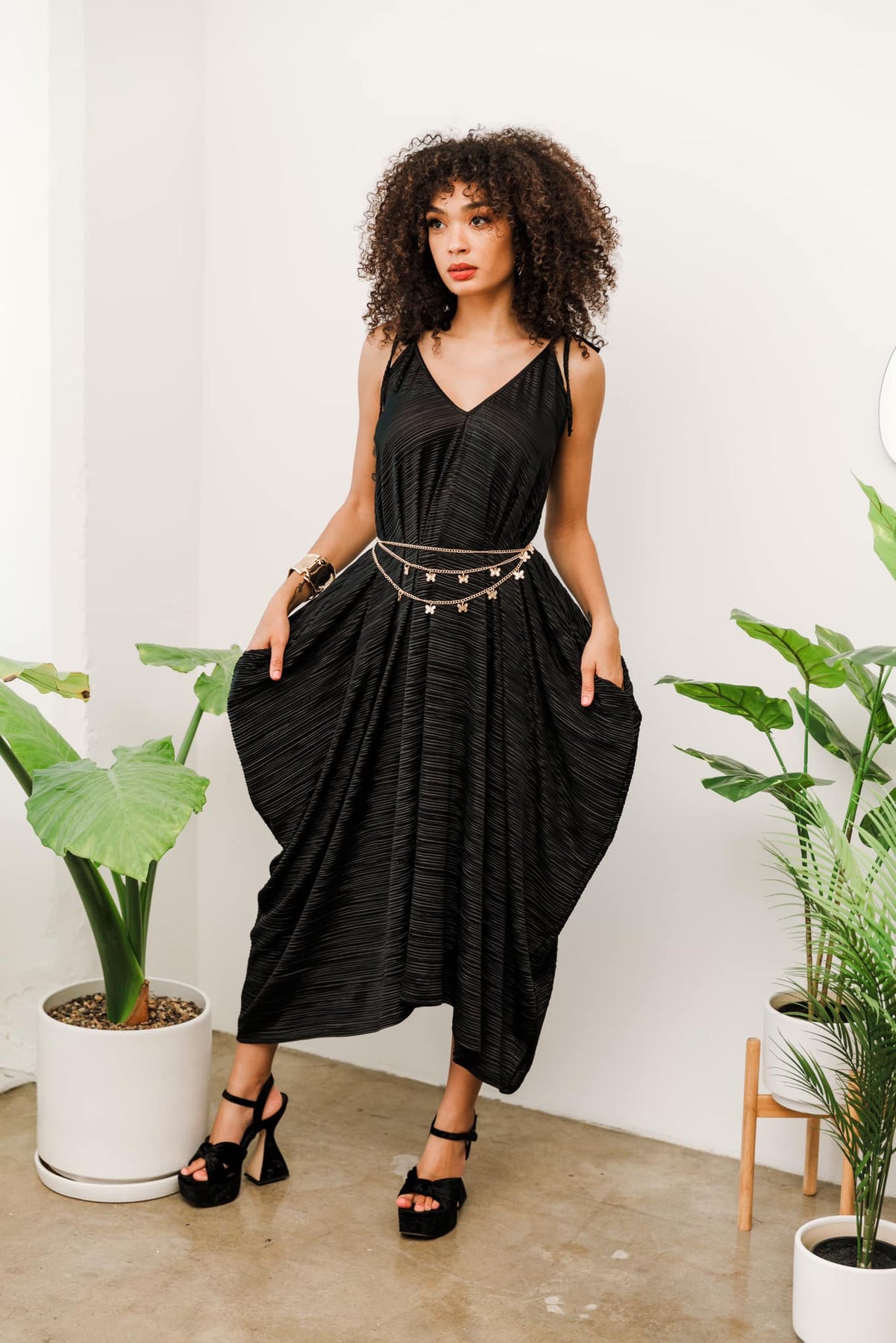 Introducing the "V is for Vinnik" Dress - a modern and sophisticated garment that seamlessly combines comfort and style. This dress takes its inspiration from the legendary designer Paul Poiret, known for his innovative designs. Our iconic "V is for Vinnik" dress is melded into one beautiful, comfortable, and elegant maxi dress you'll want to live in all year round. The dress features bias spaghetti straps which add an elegant touch, allowing for adjustable length and ensuring a personalized fit. Designed with practicality in mind, this dress has conveniently placed pockets, adding functionality to your ensemble without compromising style. Wear it during the warm seasons either loose or belted and add a turtleneck underneath during winter months to have endless options to shop your closet and restyle this dress for years to come.