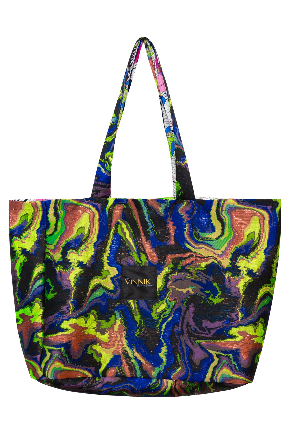 Double the style, double the function. This Flip Side Tote Bag is thoughtfully designed for versatility and sustainability. Yes, it is REVERSIBLE! One side features a luxurious premium jacquard for a refined, elevated look, while the reverse reveals a playful novelty cotton print—perfect for when you want to show off your fun side. It is oversized. It is fun!