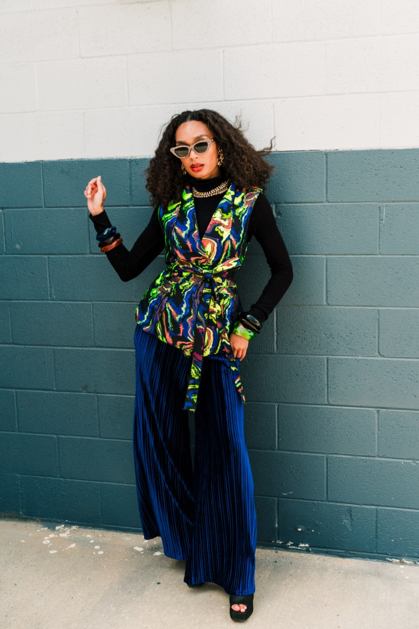 Channel timeless sophistication with this vintage-inspired jacquard waistcoat, where classic charm meets modern functionality. Designed with functional front pockets, it combines heritage style with everyday practicality. The self-tie back allows for an adjustable, tailored fit—cinching the waist. Whether paired with high-waisted trousers, a flowing skirt, bodysuit, or layered over a blouse, this waistcoat brings a touch of old-world refinement to any ensemble.