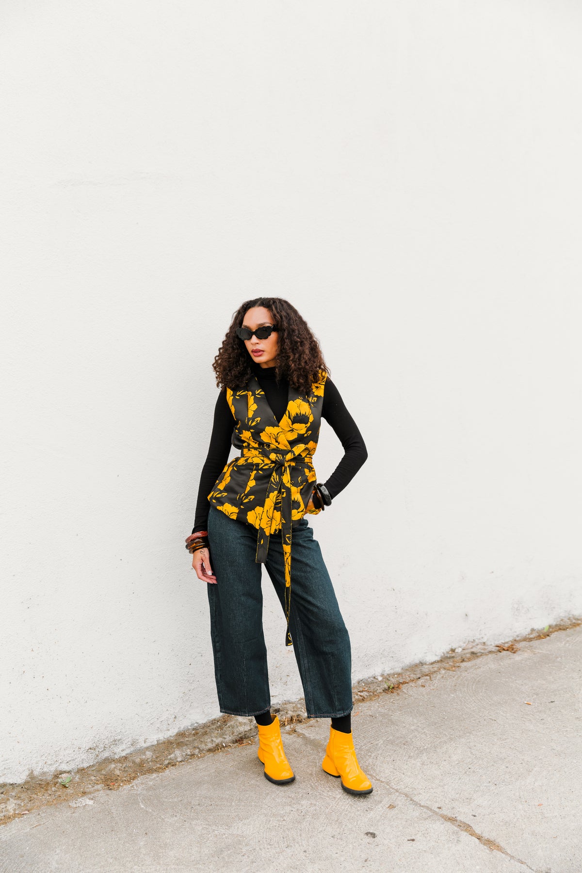Channel timeless sophistication with this vintage-inspired jacquard waistcoat, where classic charm meets modern functionality. Designed with functional front pockets, it combines heritage style with everyday practicality. The self-tie back allows for an adjustable, tailored fit cinching at the waist. Whether paired with high-waisted trousers, a flowing skirt, bodysuit, or layered over a blouse, this waistcoat brings a touch of old-world refinement to any ensemble.