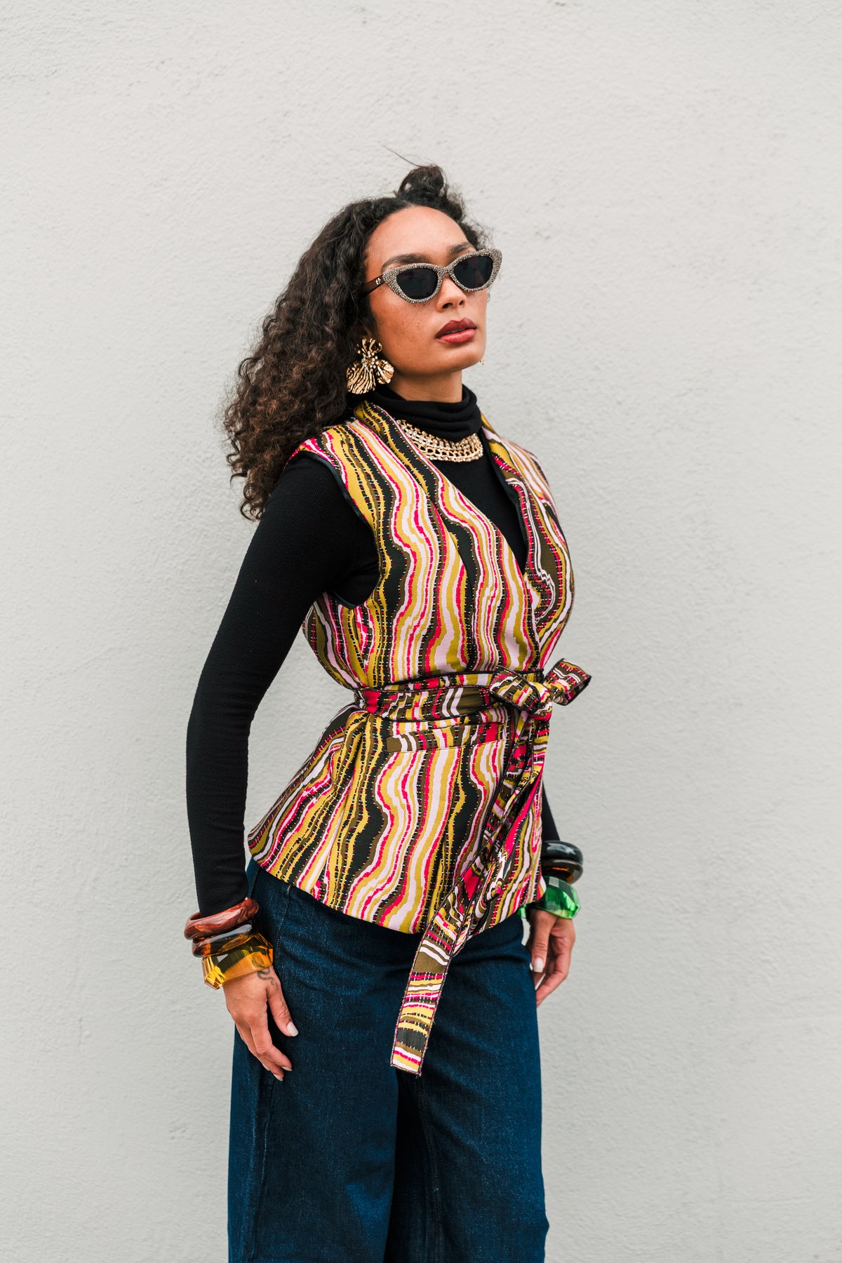 Channel timeless sophistication with this vintage-inspired jacquard waistcoat, where classic charm meets modern functionality. Designed with functional front pockets, it combines heritage style with everyday practicality. The self-tie back allows for an adjustable, tailored fit—cinching the waist. Whether paired with high-waisted trousers, a flowing skirt, bodysuit, or layered over a blouse, this waistcoat brings a touch of old-world refinement to any ensemble.