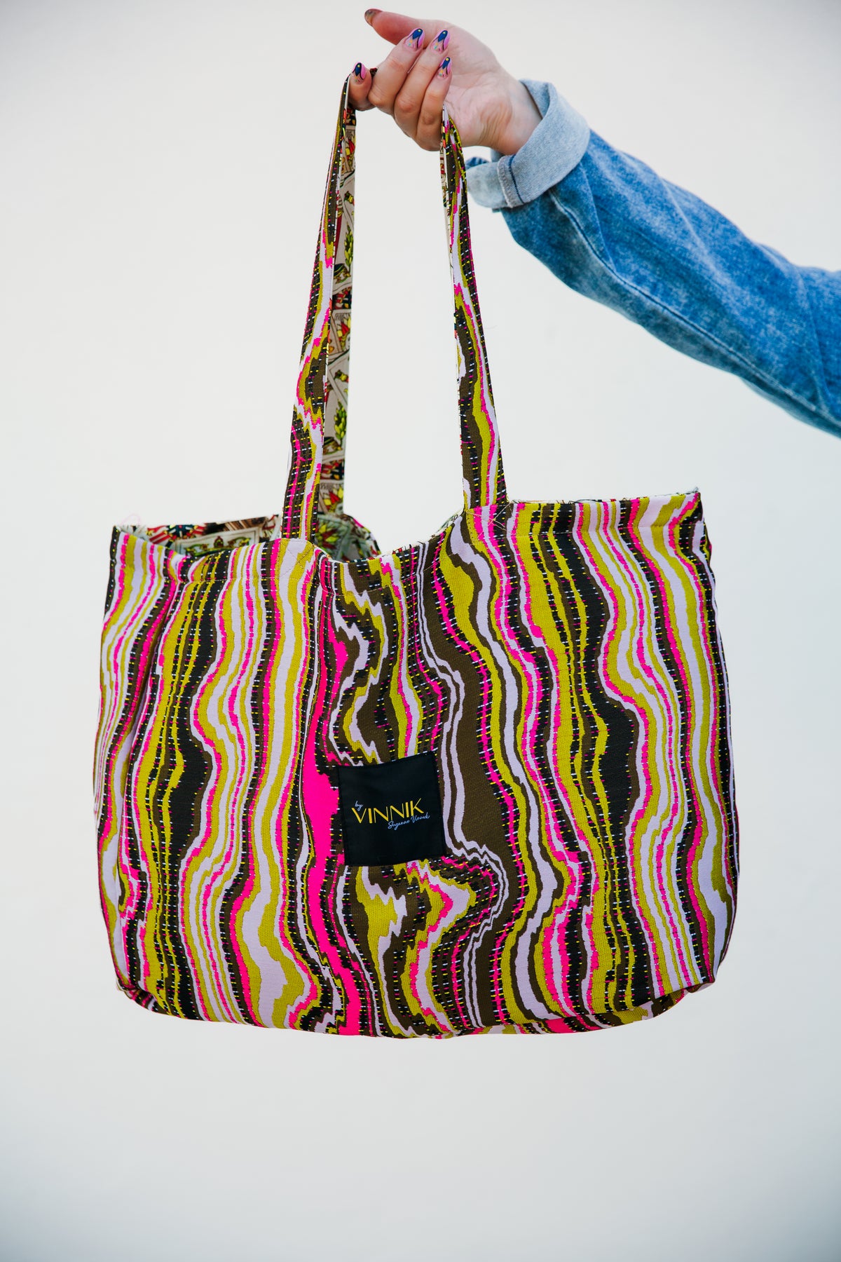 Double the style, double the function. This Flip Side Tote Bag is thoughtfully designed for versatility and sustainability. Yes, it is REVERSIBLE! One side features a luxurious premium jacquard for a refined, elevated look, while the reverse reveals a playful novelty cotton print—perfect for when you want to show off your fun side. It is oversized. It is fun!
