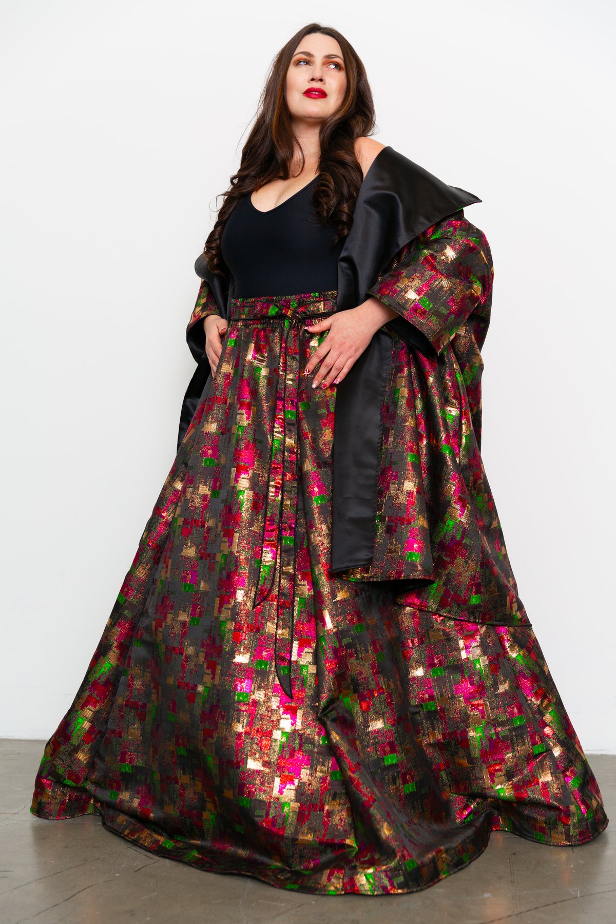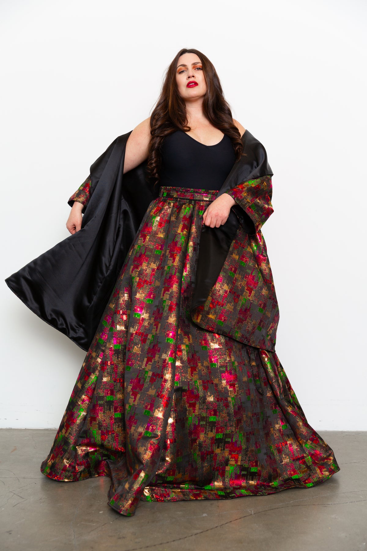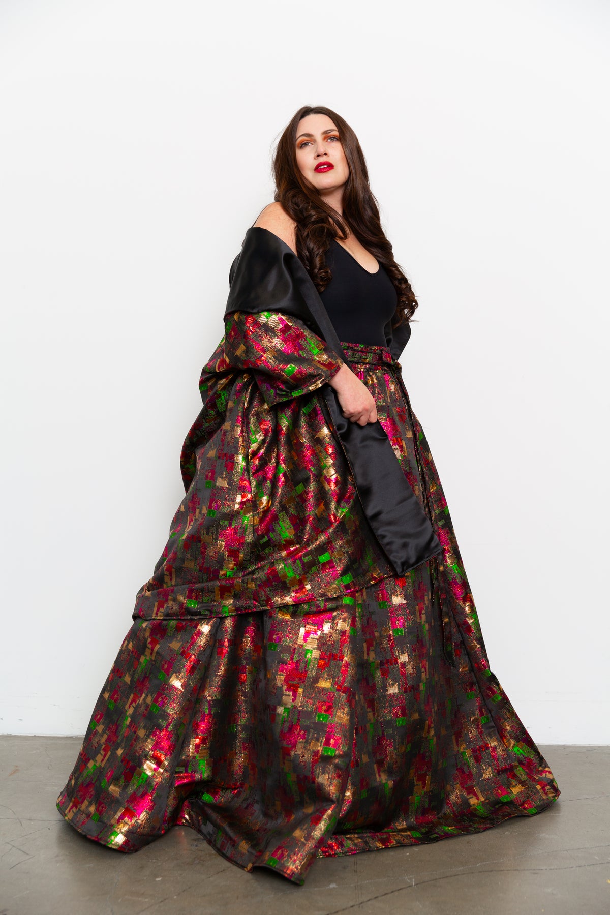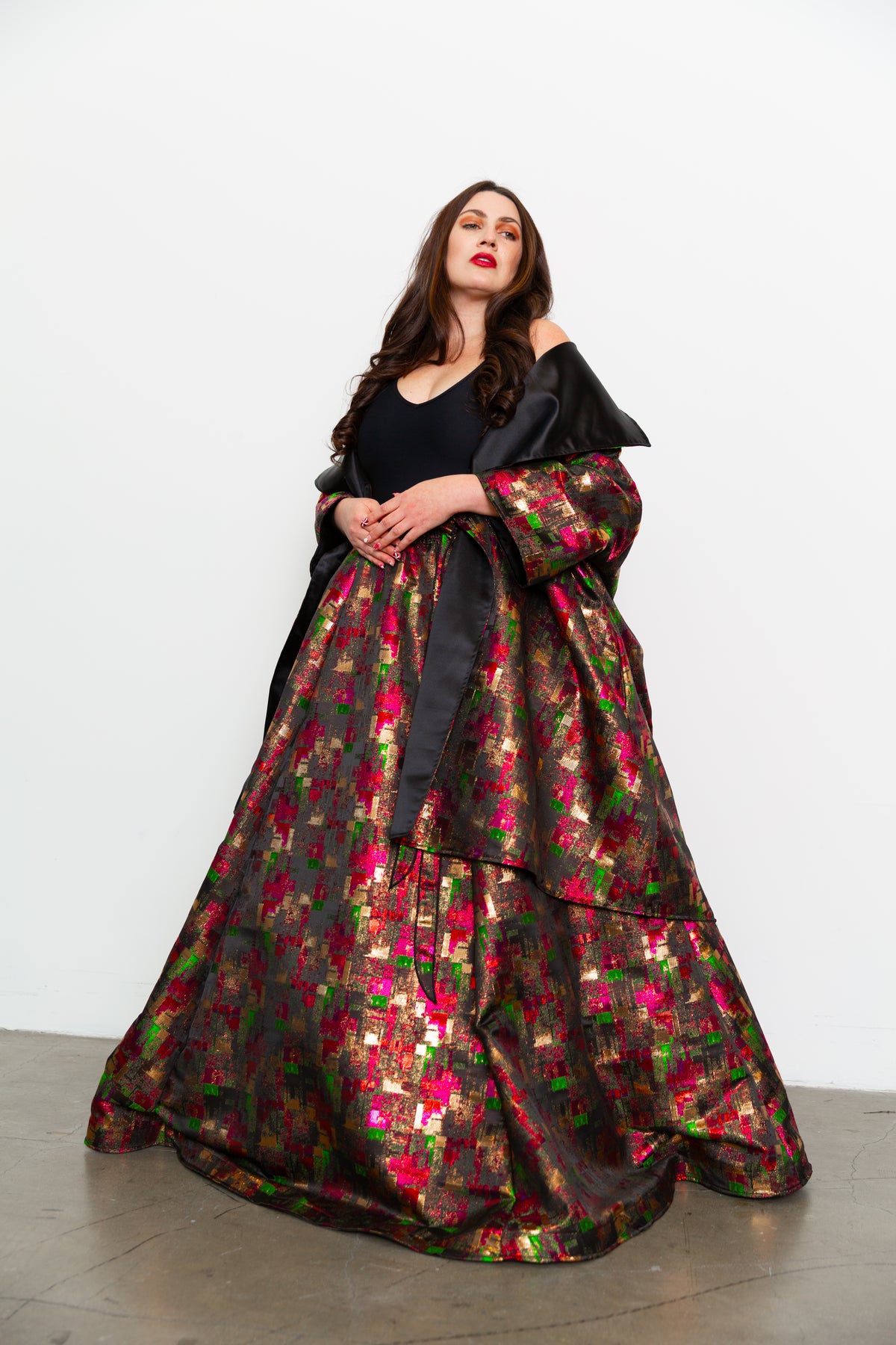 The orchestra is tuned. The audience is silent. You enter the stage and suddenly the crowd erupts into applause. Our new gorgeous skirts have been fit tested to fit divas sizes XS-4X with a luxurious smocked elastic waistband and dramatic panels of the finest jacquard in the world. Finishing off the details, you have a horsehair hemline to hold the shape of the skirt. Add a crinoline underneath for additional floof (sold separately). Pair it with matching outerwear for a showstopper moment.