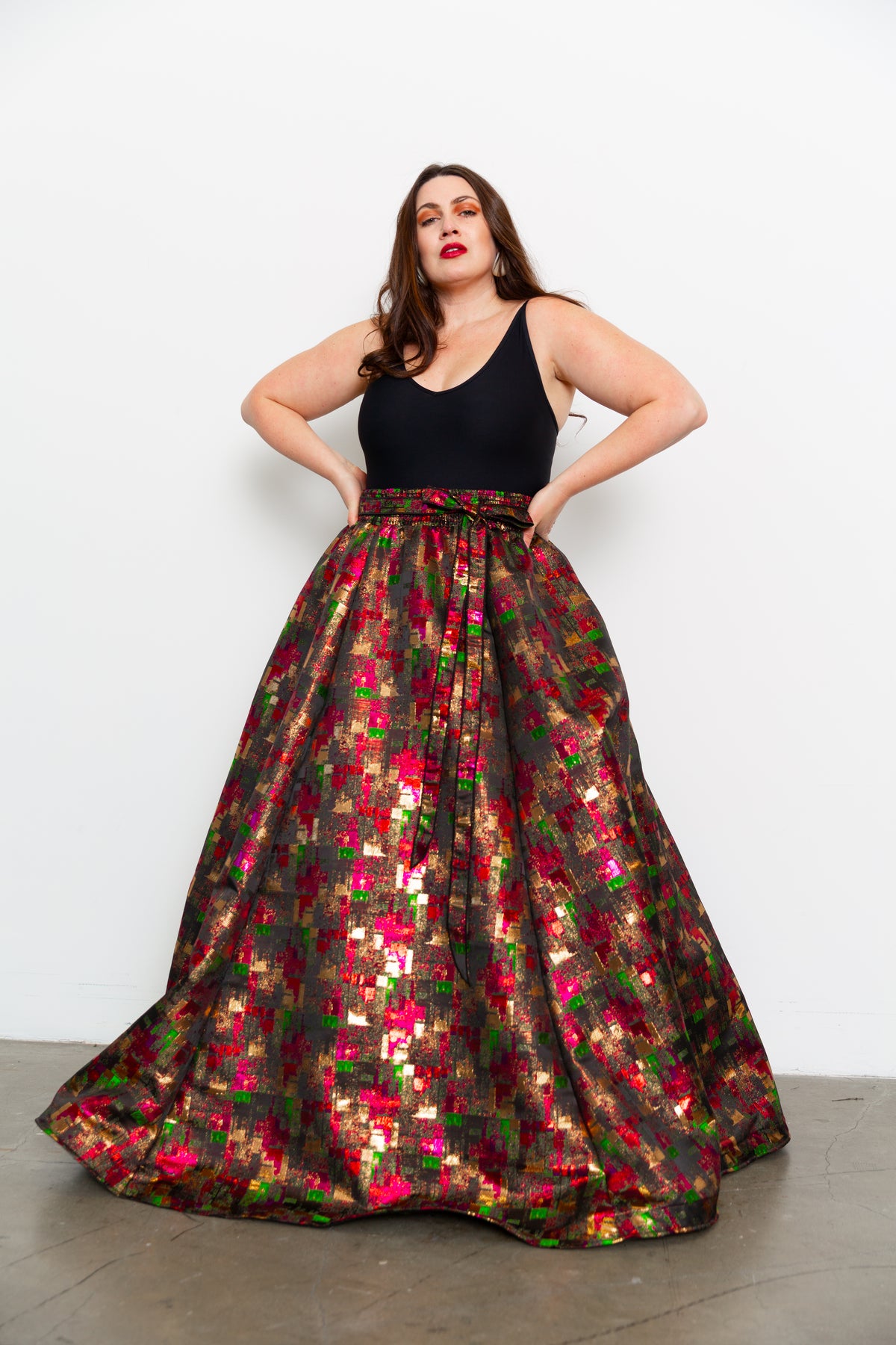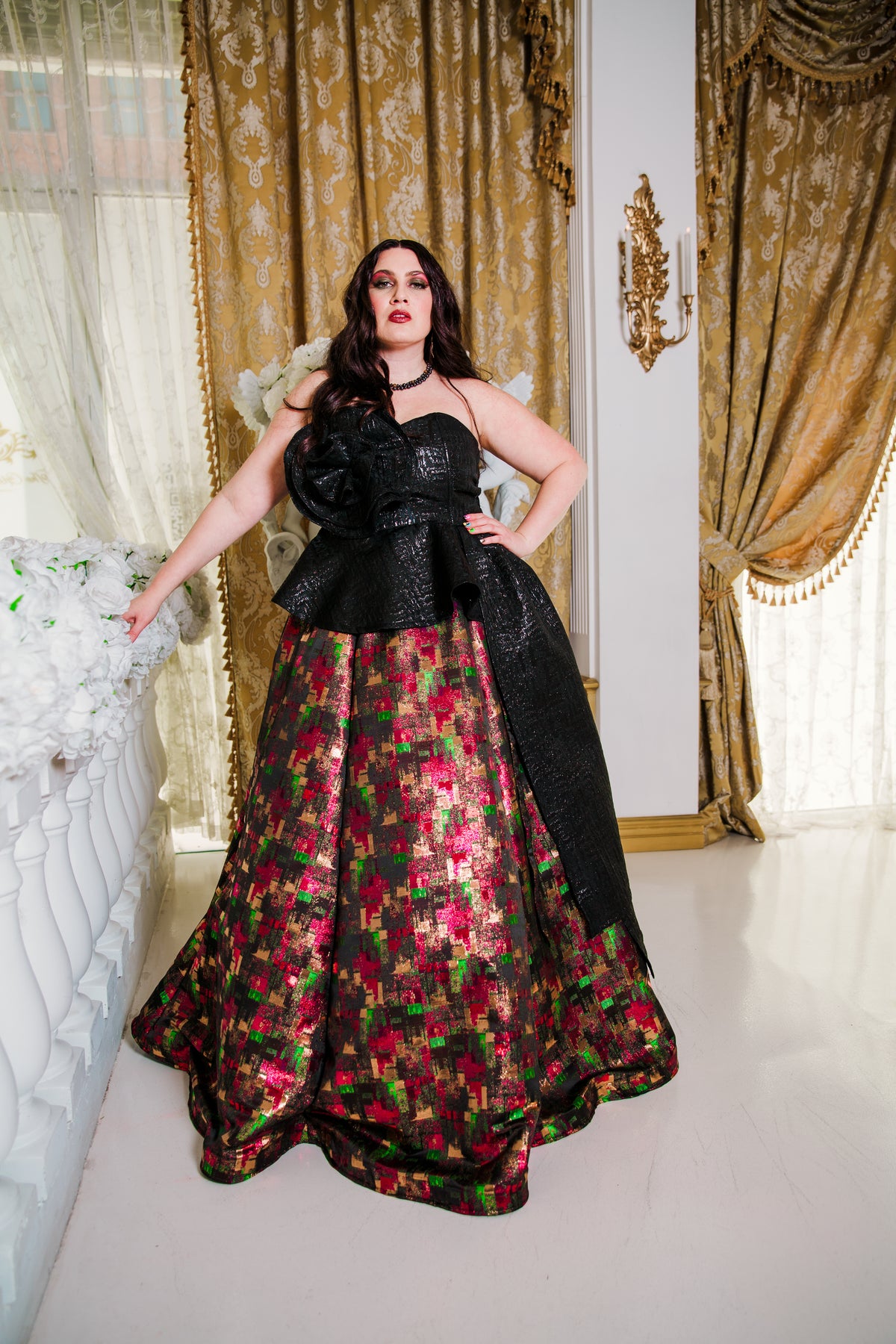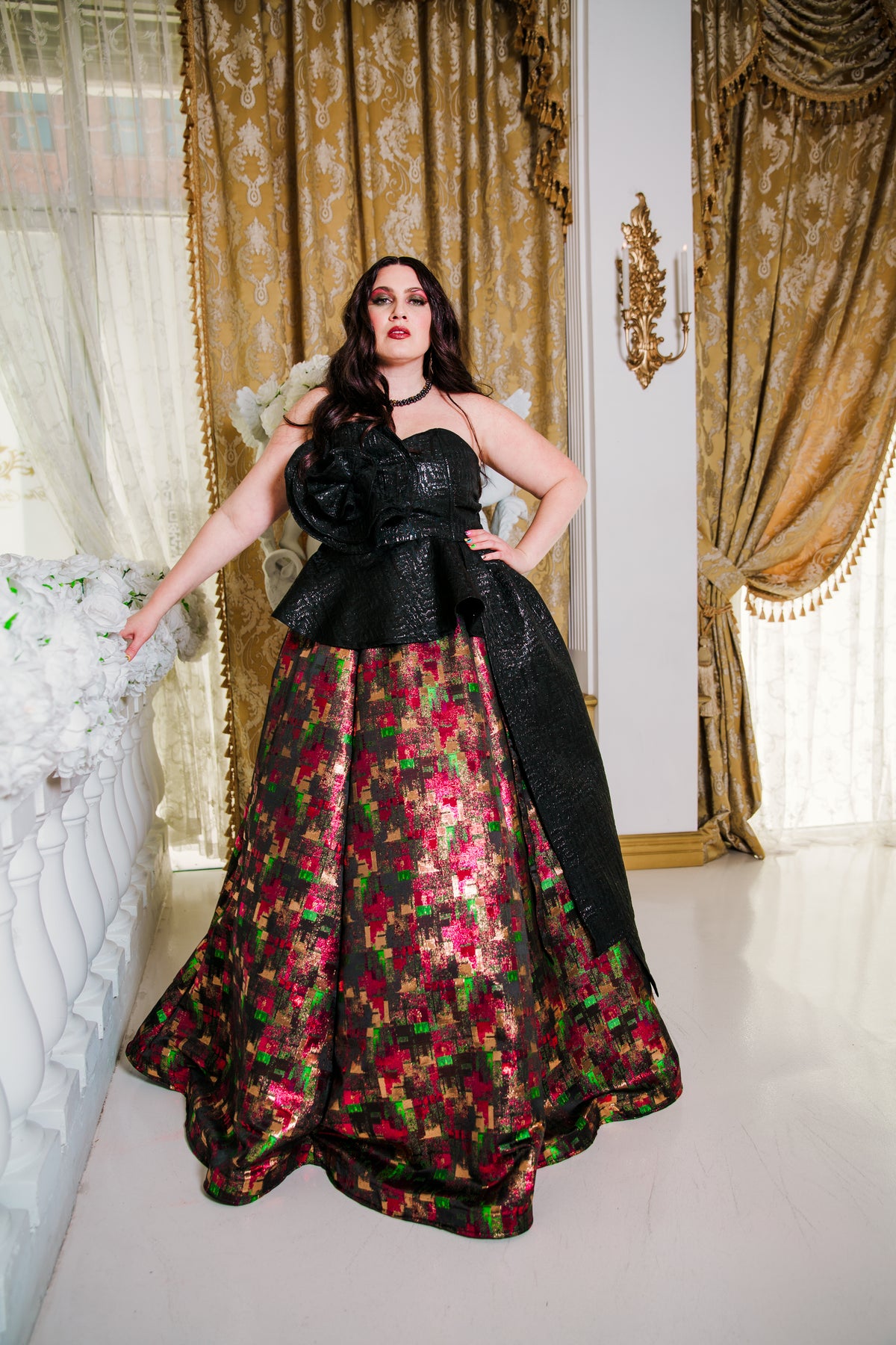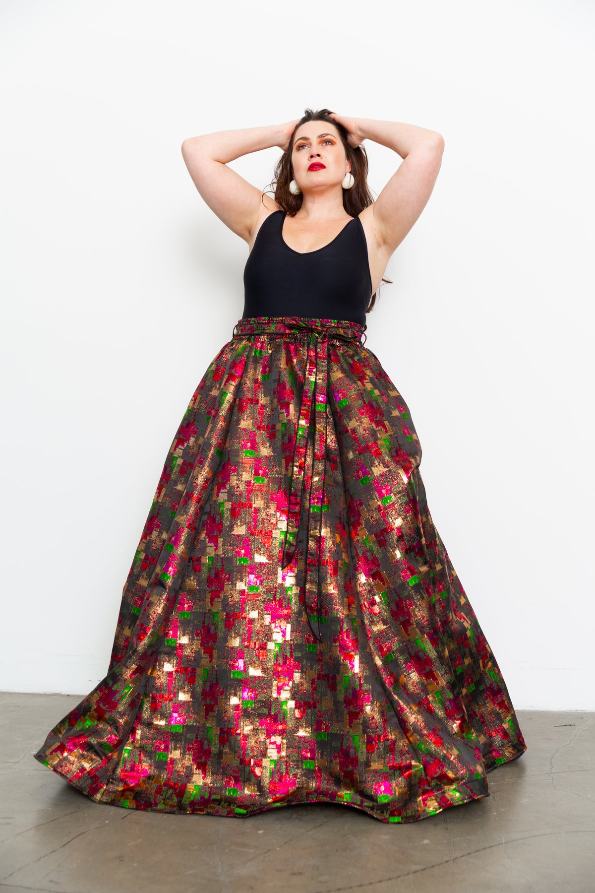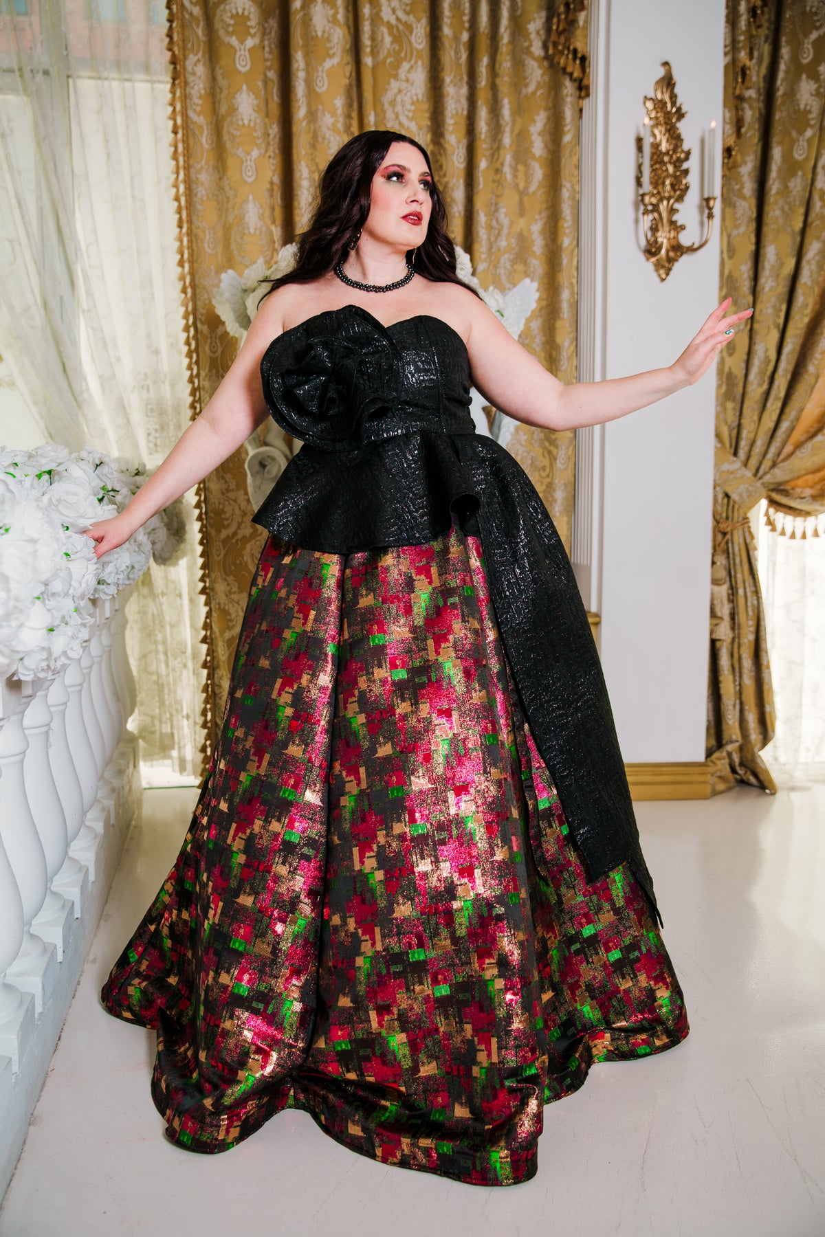The orchestra is tuned. The audience is silent. You enter the stage and suddenly the crowd erupts into applause. Our new gorgeous skirts have been fit tested to fit divas sizes XS-4X with a luxurious smocked elastic waistband and dramatic panels of the finest jacquard in the world. Finishing off the details, you have a horsehair hemline to hold the shape of the skirt. Add a crinoline underneath for additional floof (sold separately). Pair it with matching outerwear for a showstopper moment.