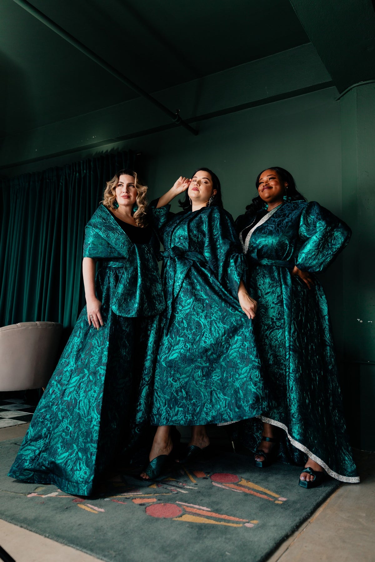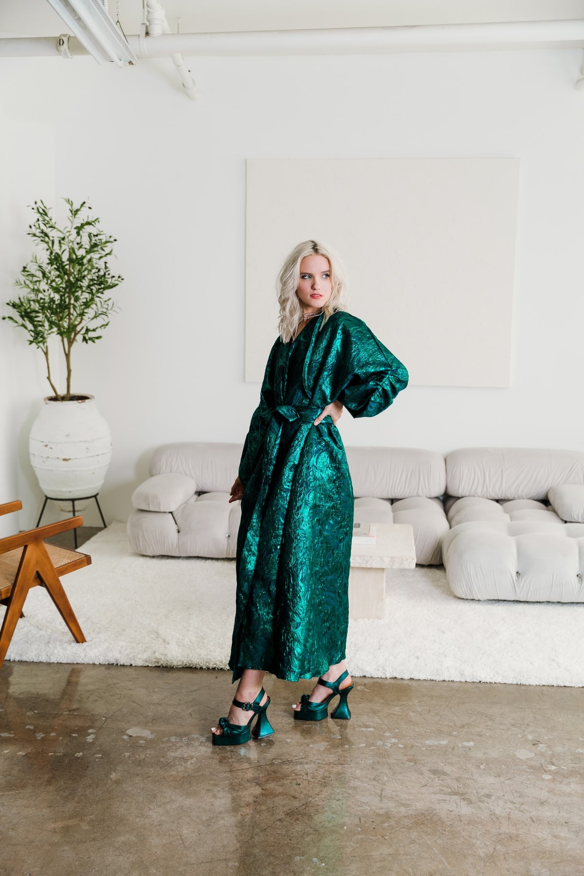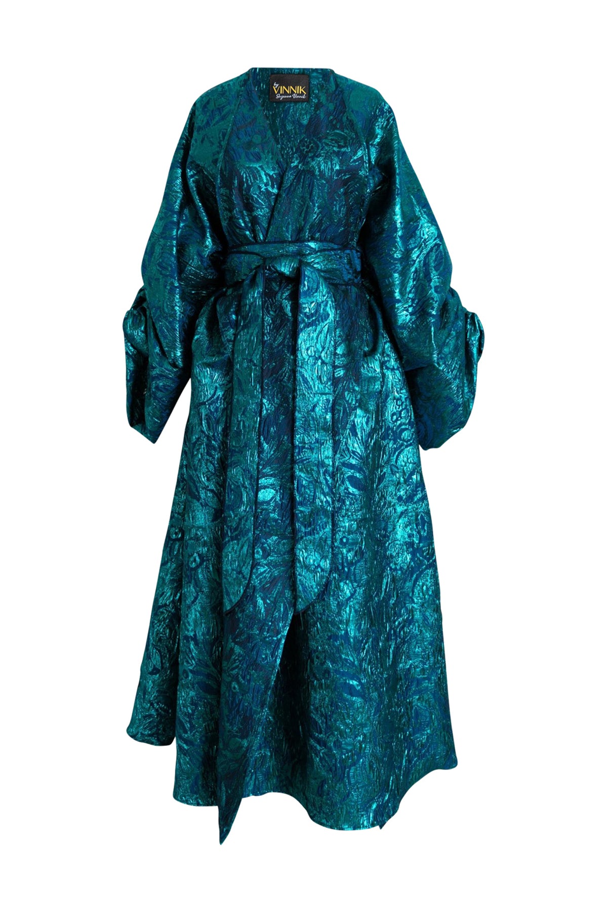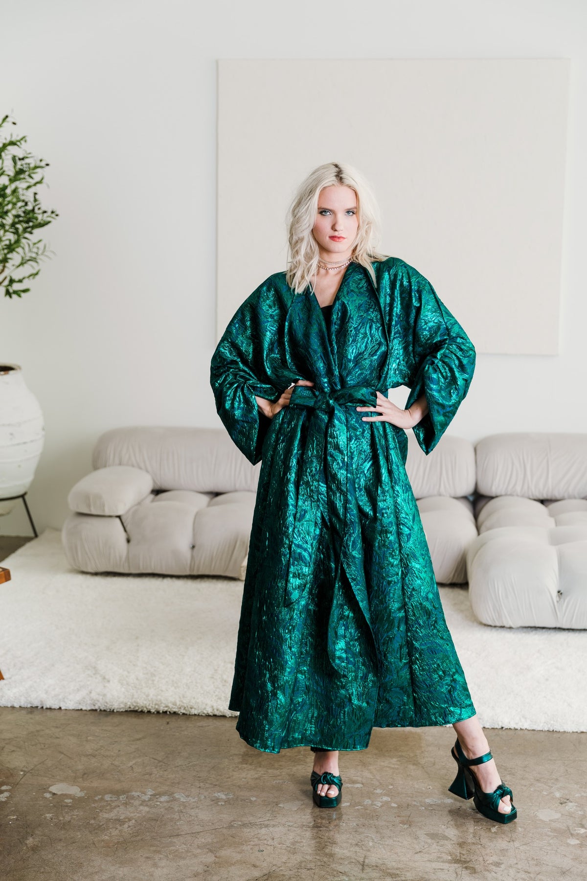 Our iconic Parisian Coat is perfect for being seen at a black tie affair or lounging on your fainting couch in the comfort of your home. We've seen divas pair them with their favorite fashion sneakers, worn open with the belt tied at the waist, over gowns, to the store, and on red carpets. You'll love the wide lapels with the deliciously decadent ruched sleeve. This design was inspired by Parisian couture made in our elaborately rich jacquards. Live out your fantasy in this show-stopping coat exclusive to byVINNIK.