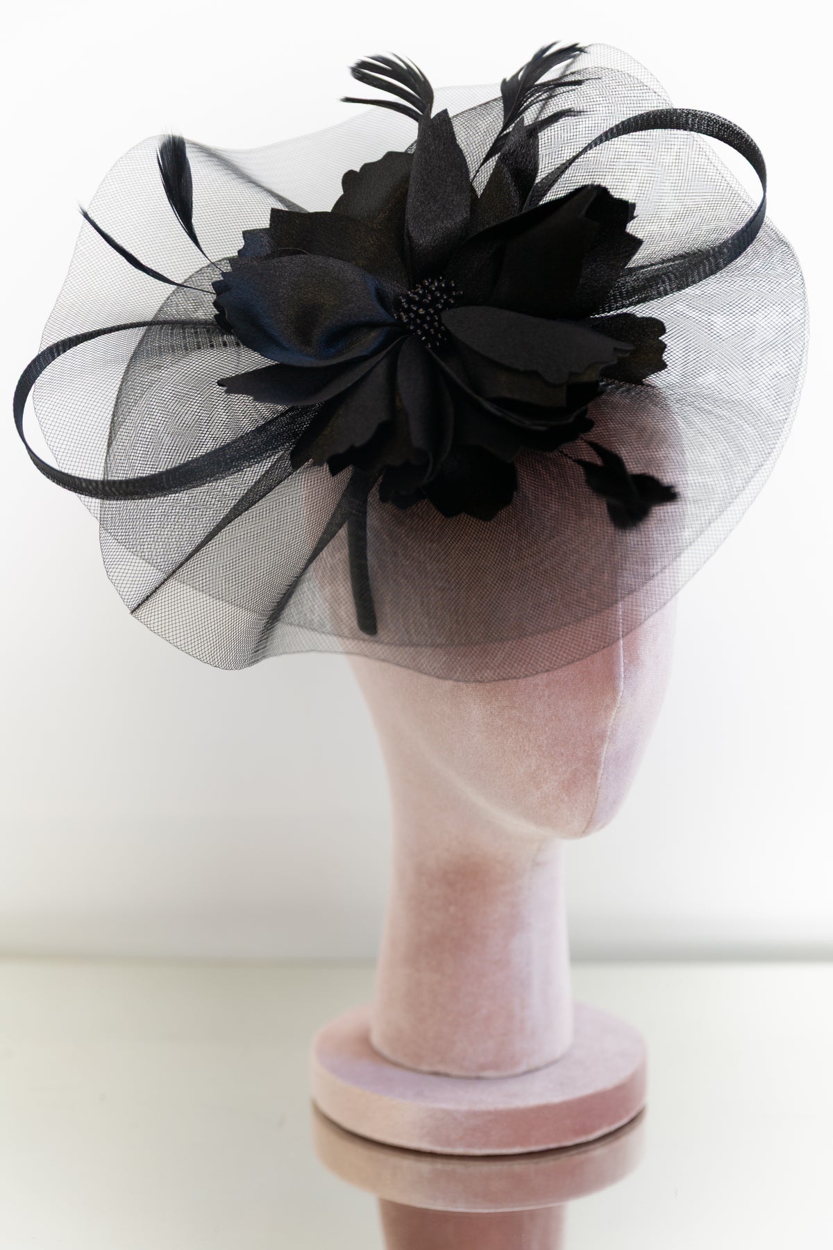 This beautiful organza fascinator features beautiful roses, feathers, black pearls, and netting. It can be worn with the attached headband or clip.