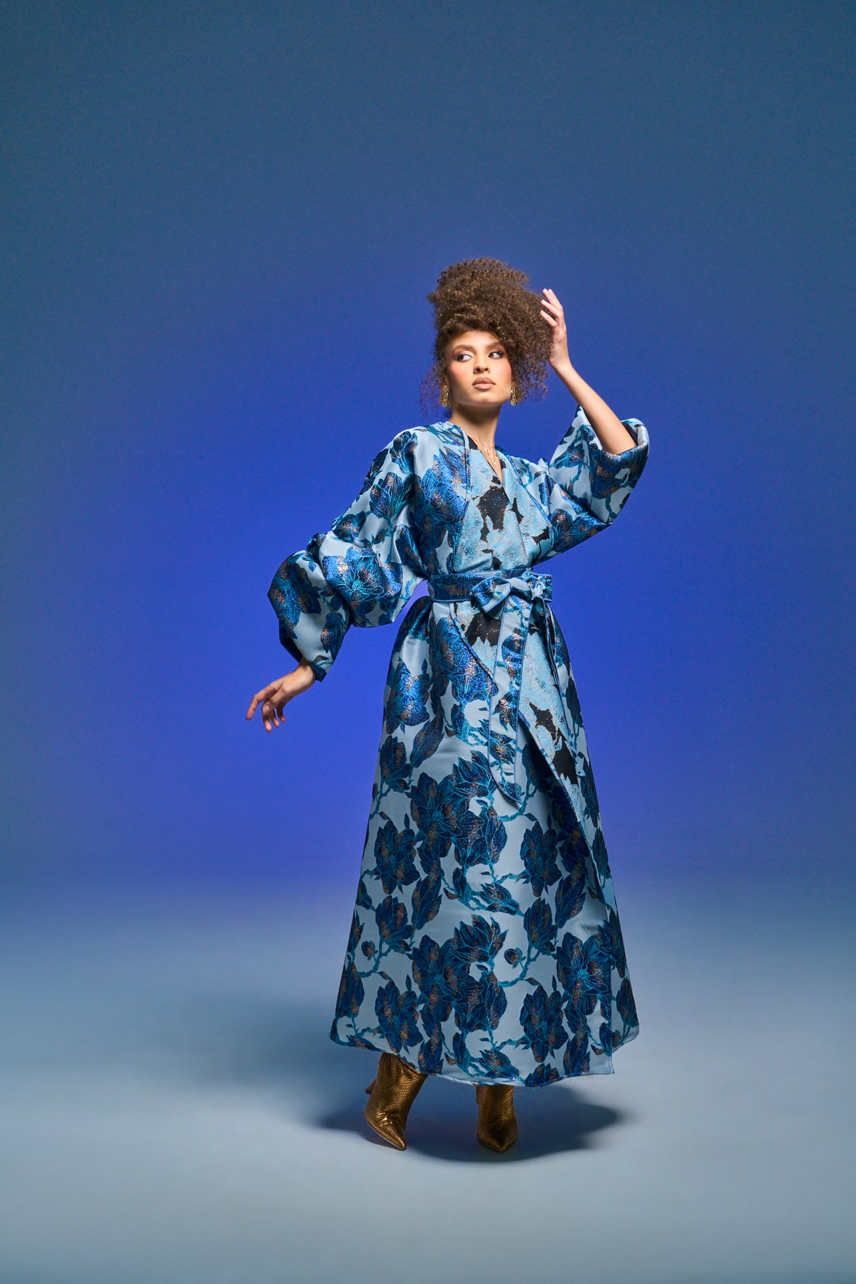 Our iconic Parisian Coat is perfect for being seen at a black tie affair or lounging on your fainting couch in the comfort of your home. We've seen divas pair them with their favorite fashion sneakers, worn open with the belt tied at the waist, over gowns, to the store, and on red carpets. You'll love the wide lapels with the deliciously decadent ruched sleeve. This design was inspired by Parisian couture made in our elaborately rich jacquards. Live out your fantasy in this show-stopping coat exclusive to byVINNIK.