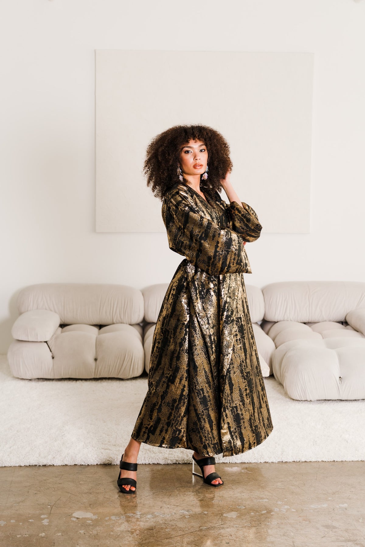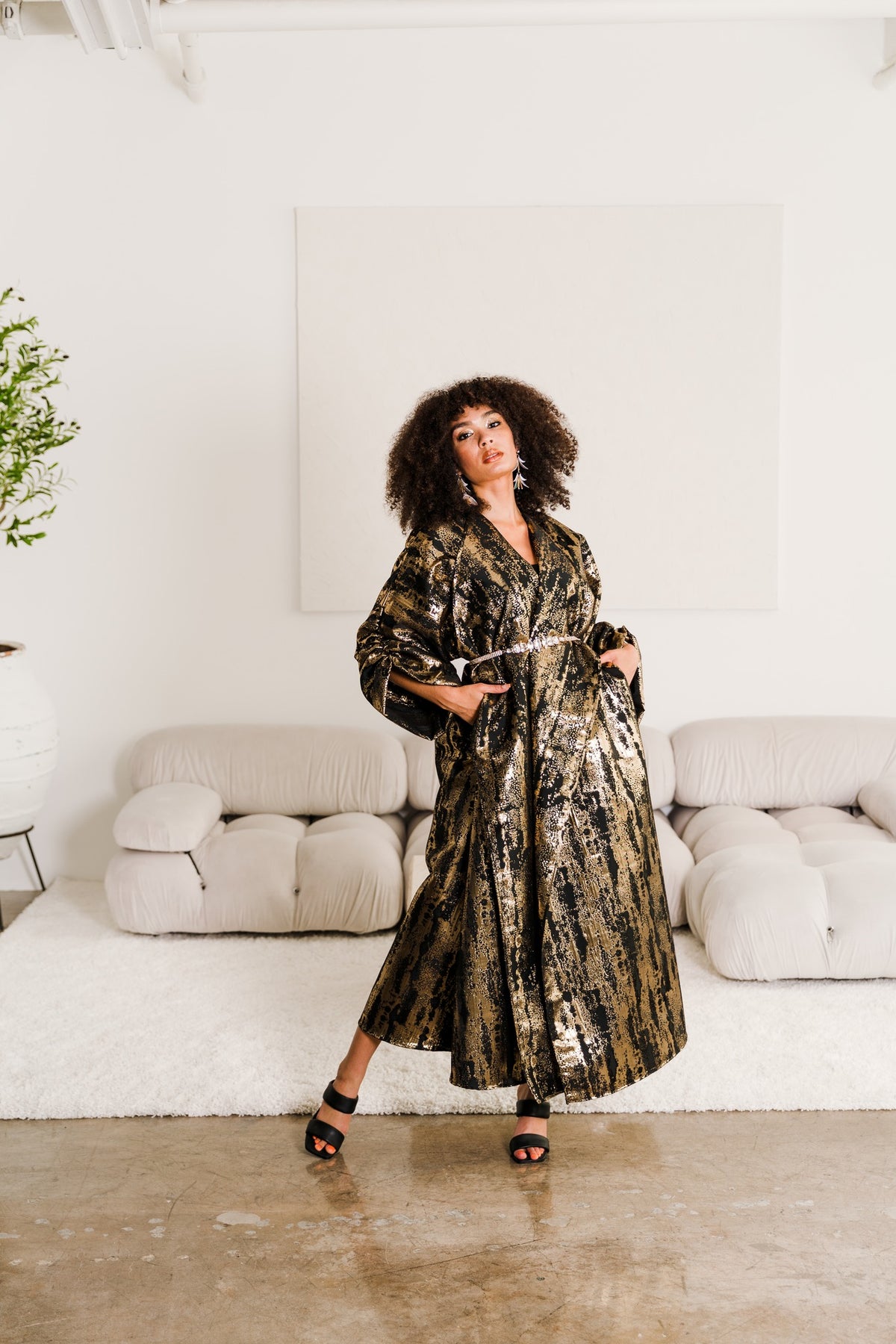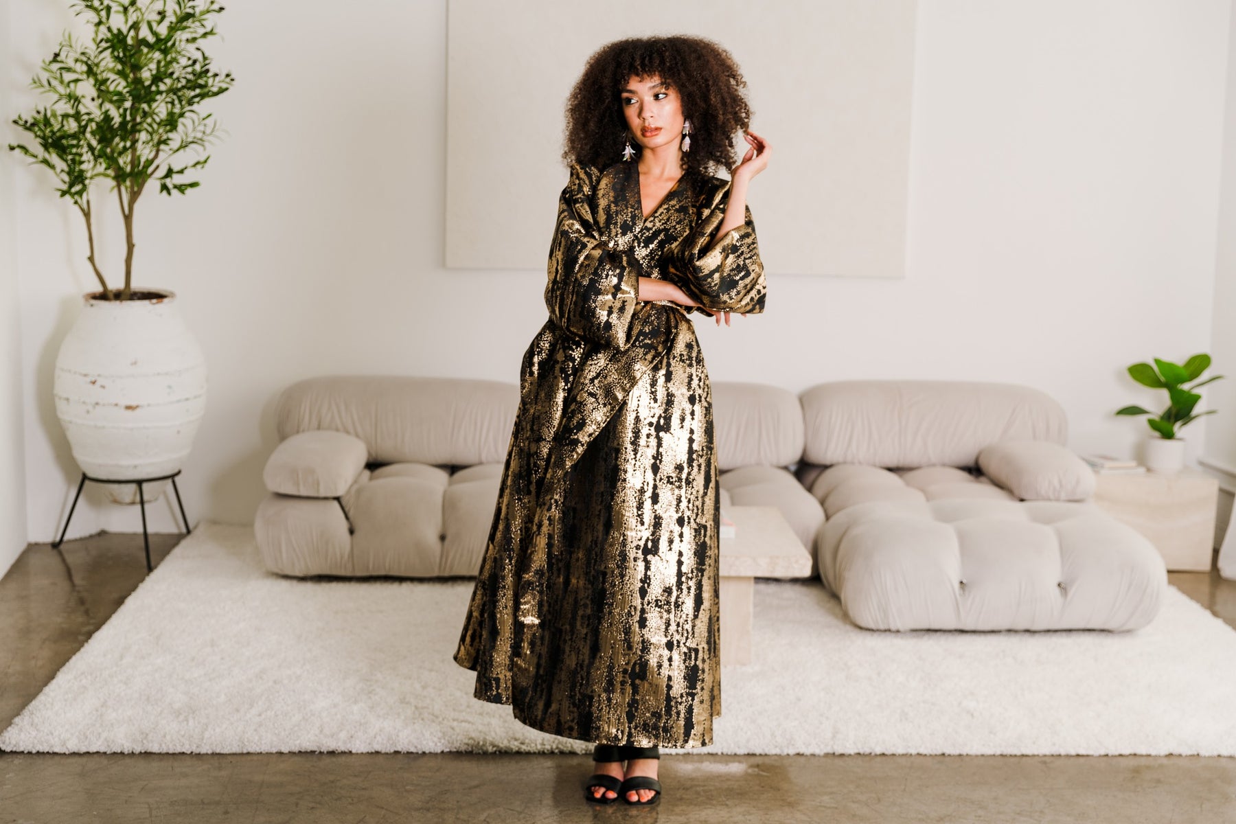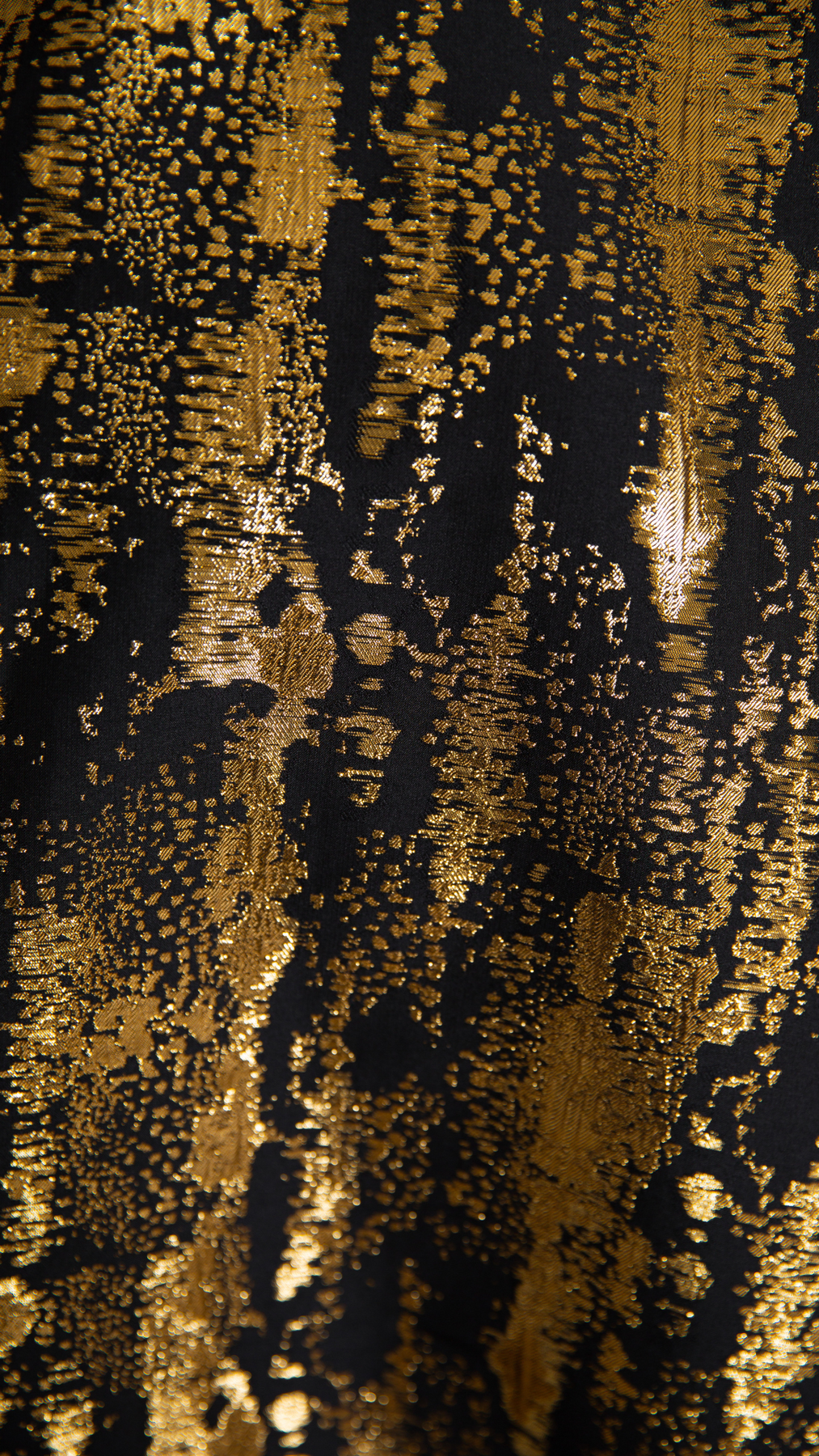 This print was seen in Taylor Swift’s “The Fate of Ophelia” 🌹 — this shimmering gold and black metallic jacquard coat embodies pure drama. Designed with ruched sleeves, fold-over lapels, and byVINNIK’s signature operatic flair, it’s a show-stopping statement made ethically in Los Angeles.