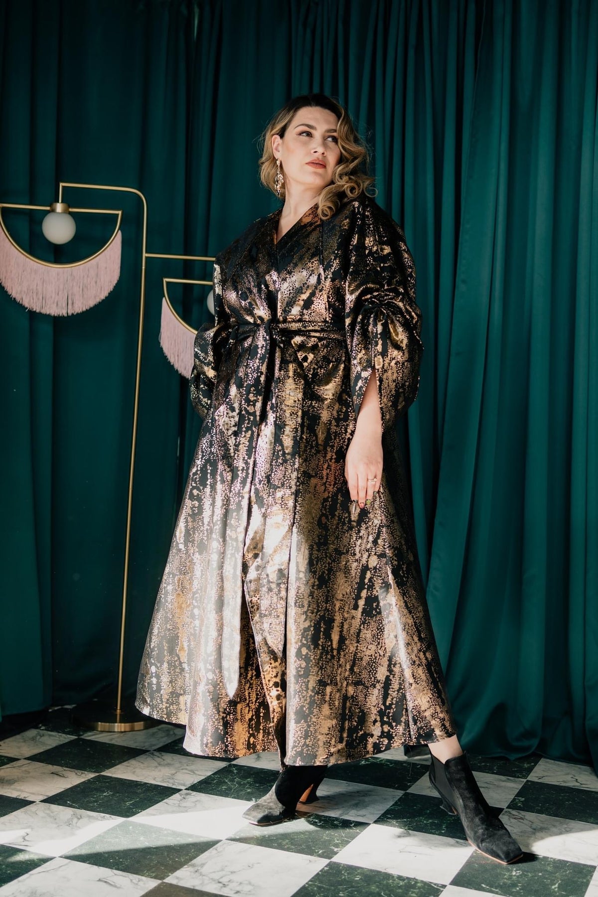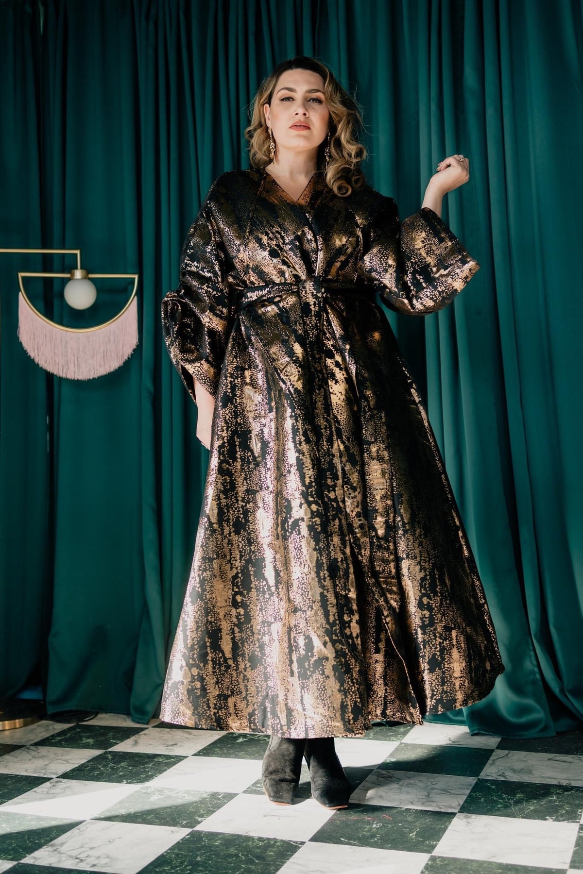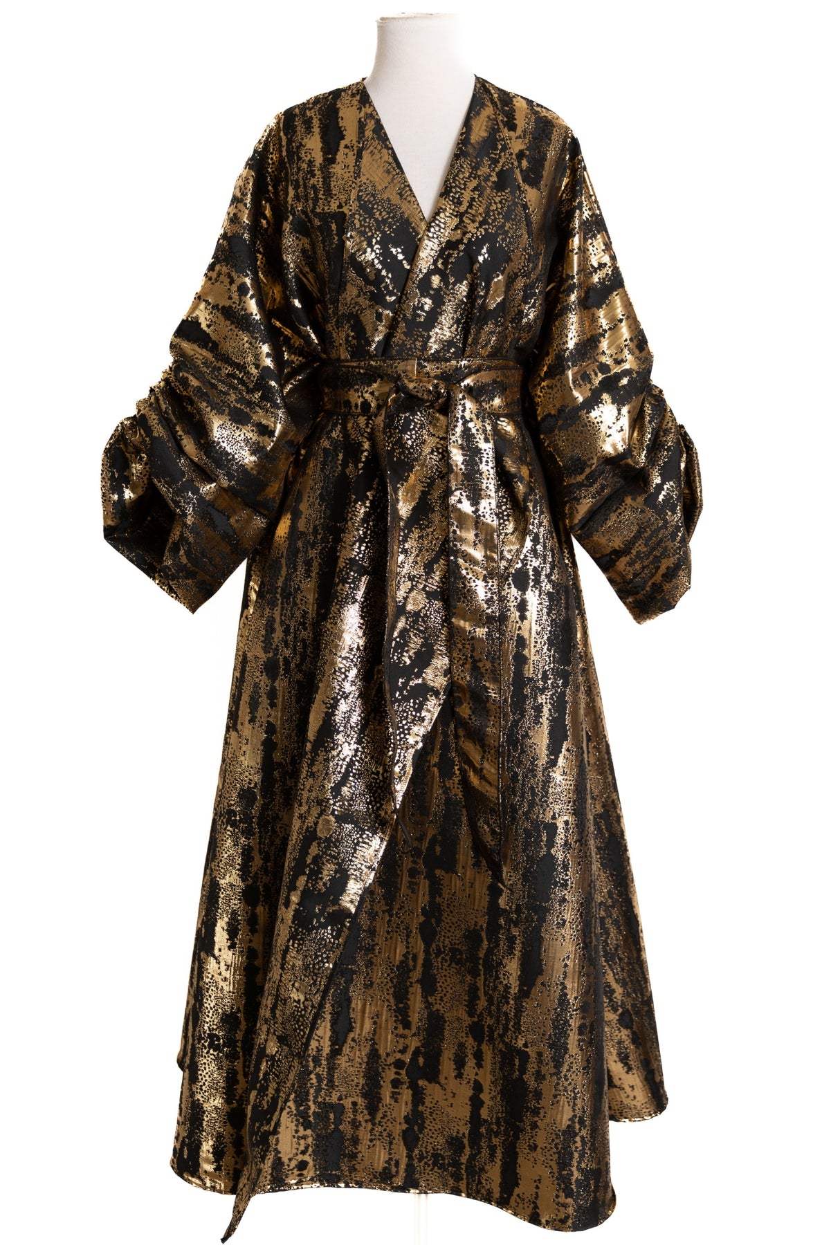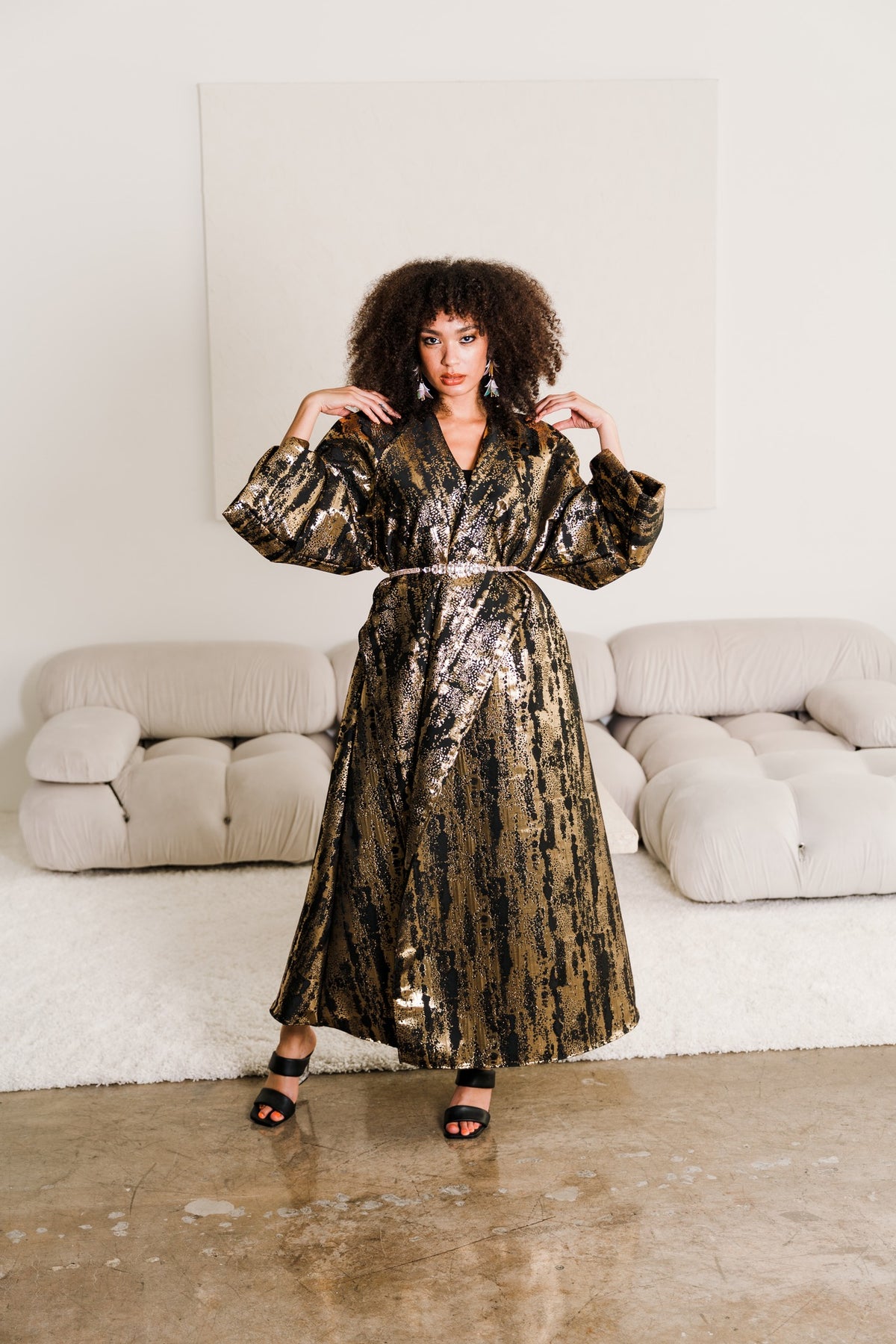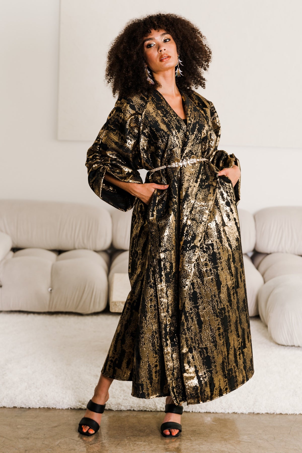 This print was seen in Taylor Swift’s “The Fate of Ophelia” 🌹 — this shimmering gold and black metallic jacquard coat embodies pure drama. Designed with ruched sleeves, fold-over lapels, and byVINNIK’s signature operatic flair, it’s a show-stopping statement made ethically in Los Angeles.