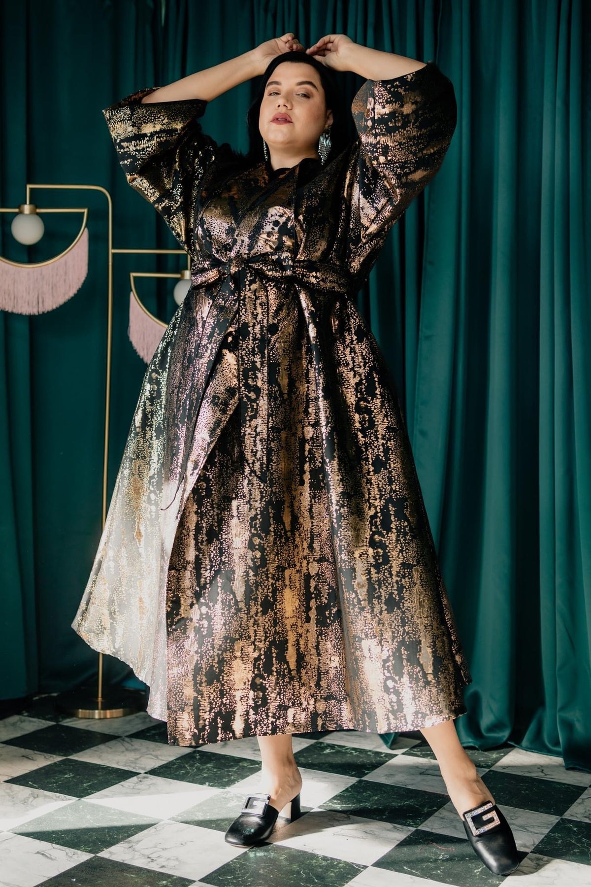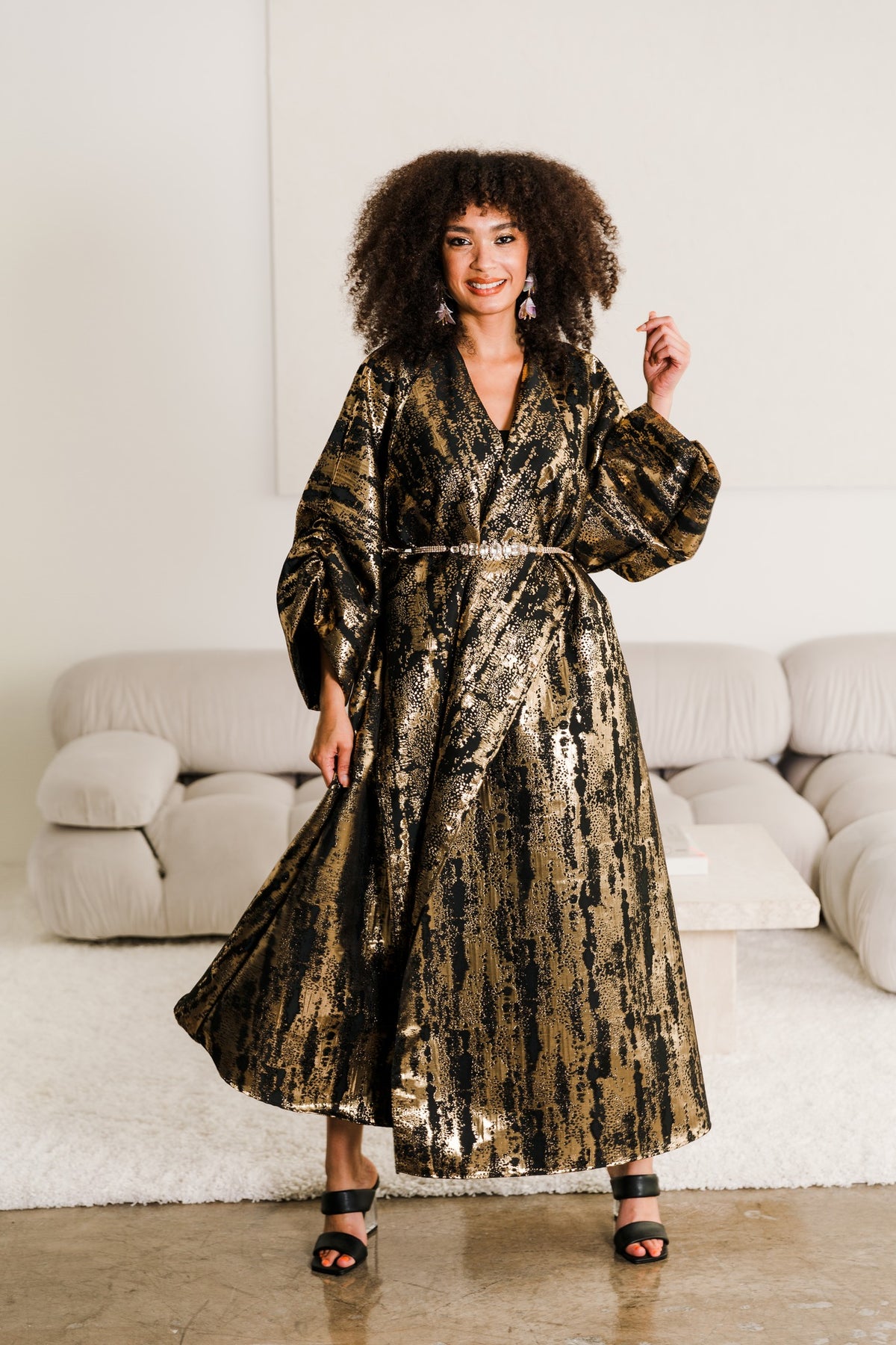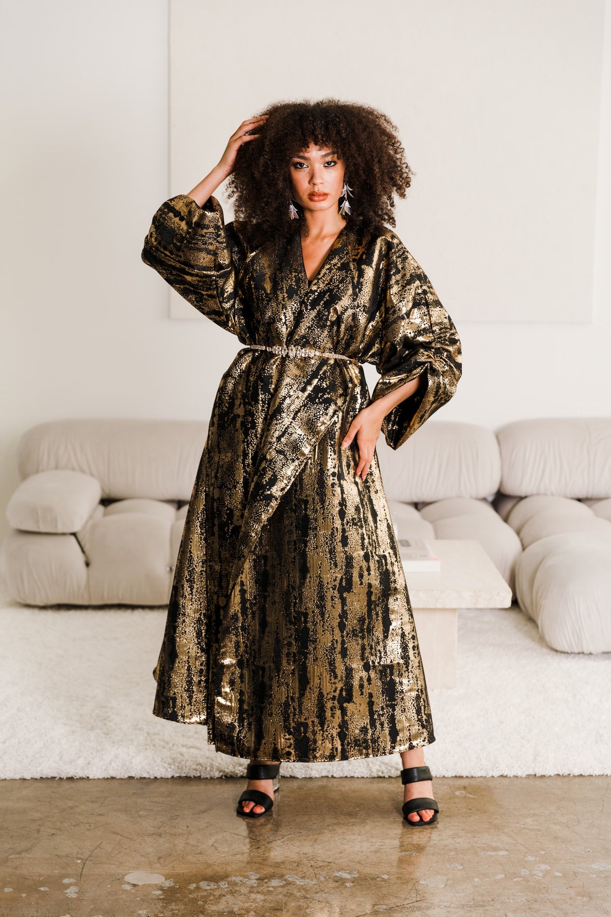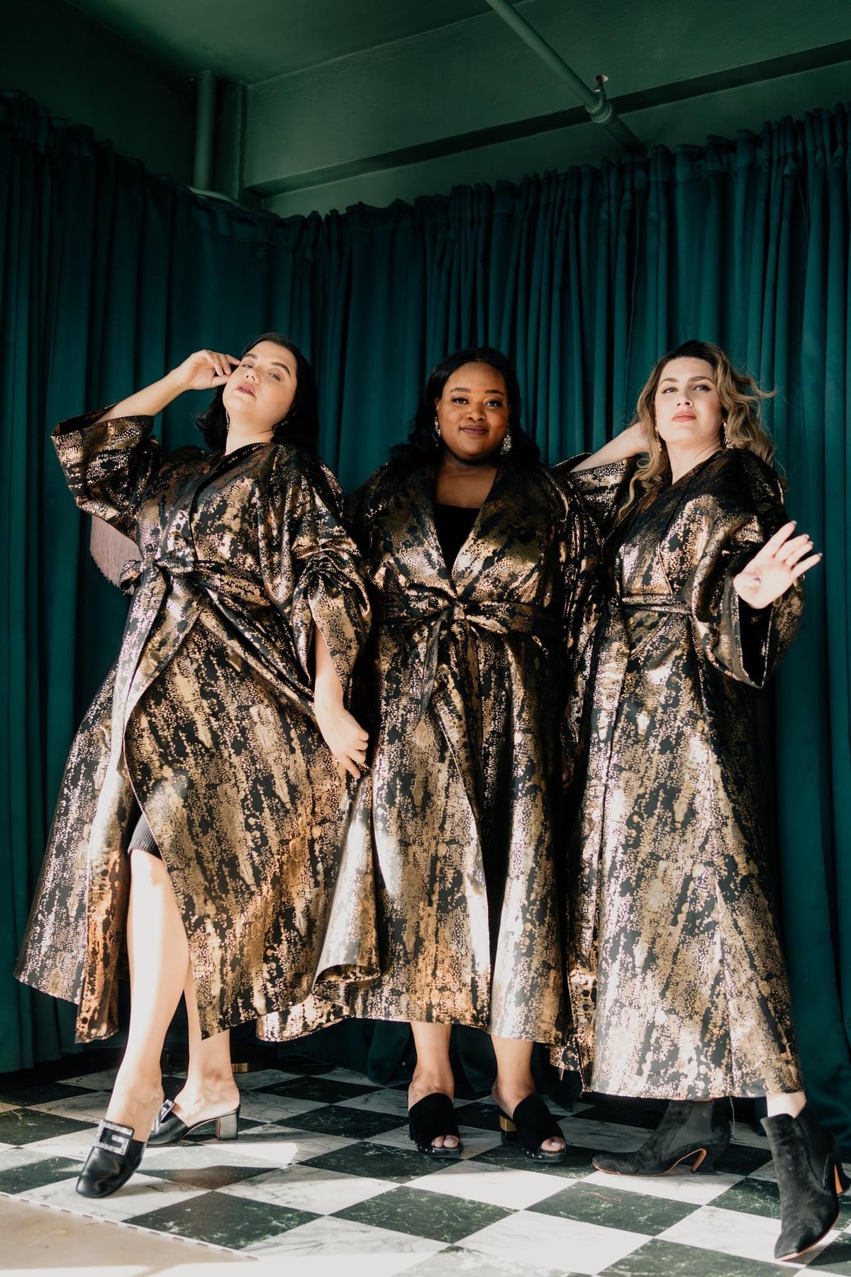 This print was seen in Taylor Swift’s “The Fate of Ophelia” 🌹 — this shimmering gold and black metallic jacquard coat embodies pure drama. Designed with ruched sleeves, fold-over lapels, and byVINNIK’s signature operatic flair, it’s a show-stopping statement made ethically in Los Angeles.