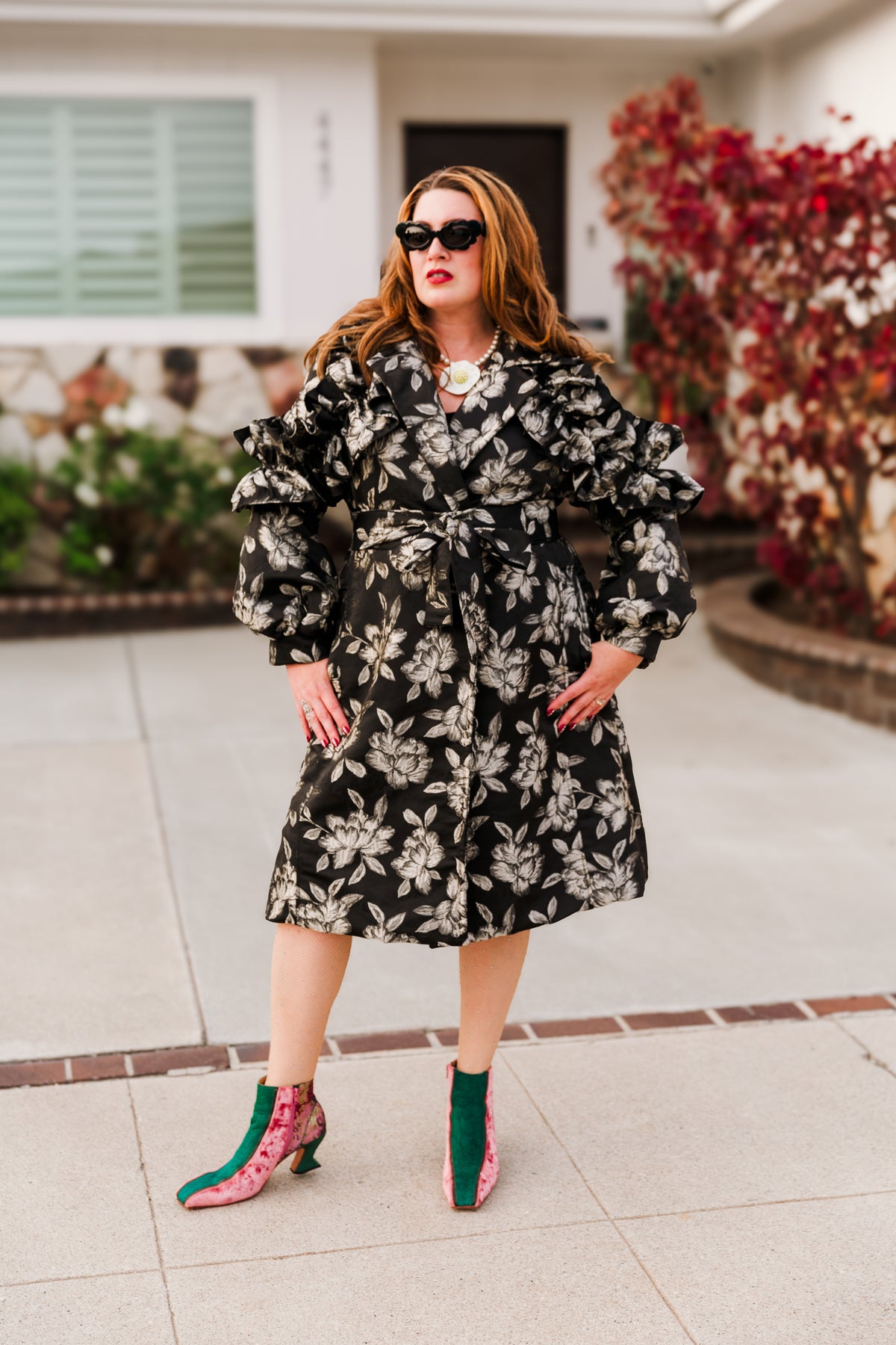 We’ve reimagined the classic trench coat silhouette and made it something unlike anything you’ve ever experienced with dramatic ruffles in place of traditional epaulets, a fused collar you can pop, and generous bishop sleeves. The soft shoulder allows for layering over your wardrobe staples with a self-tie belt you can easily adjust to your torso length. This theatrically inspired piece is perfect for walking down the street and having everyone truly see you! This striking black and reflective silvery white print with red satin charmeuse will turn heads and automatically begin playing “Casta Diva,” as you turn heads.