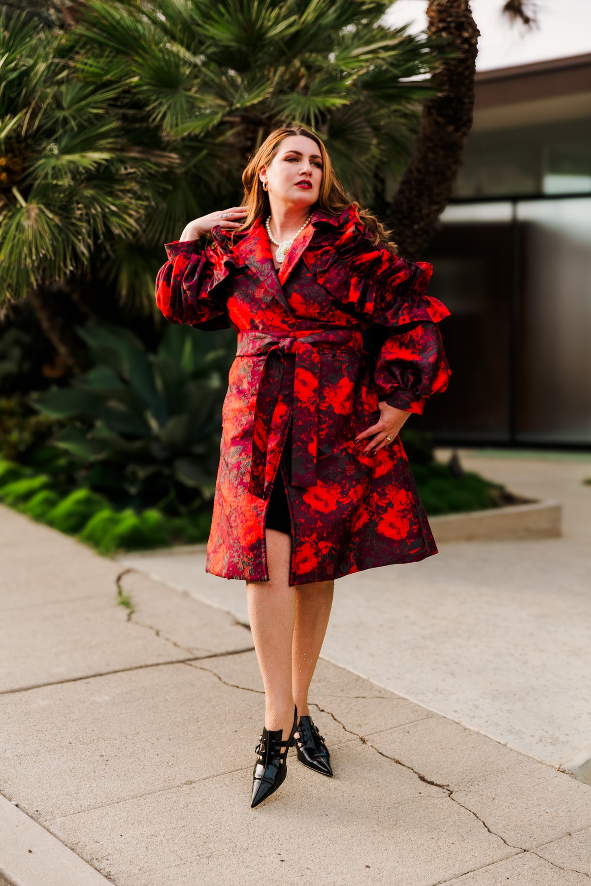 We’ve reimagined the classic trench coat silhouette and made it something unlike anything you’ve ever experienced with dramatic ruffles in place of traditional epaulets, a fused collar you can pop, and generous bishop sleeves. The soft shoulder allows for layering over your wardrobe staples with a self-tie belt you can easily adjust to your torso length. This theatrically inspired piece is perfect for walking down the street and having everyone truly see you!