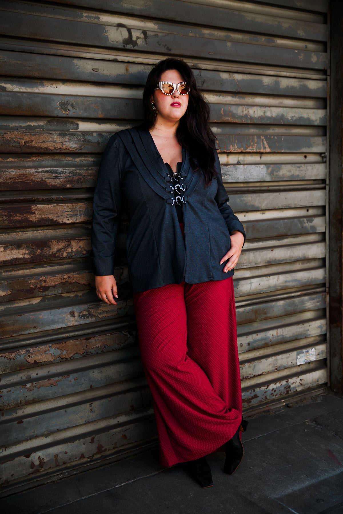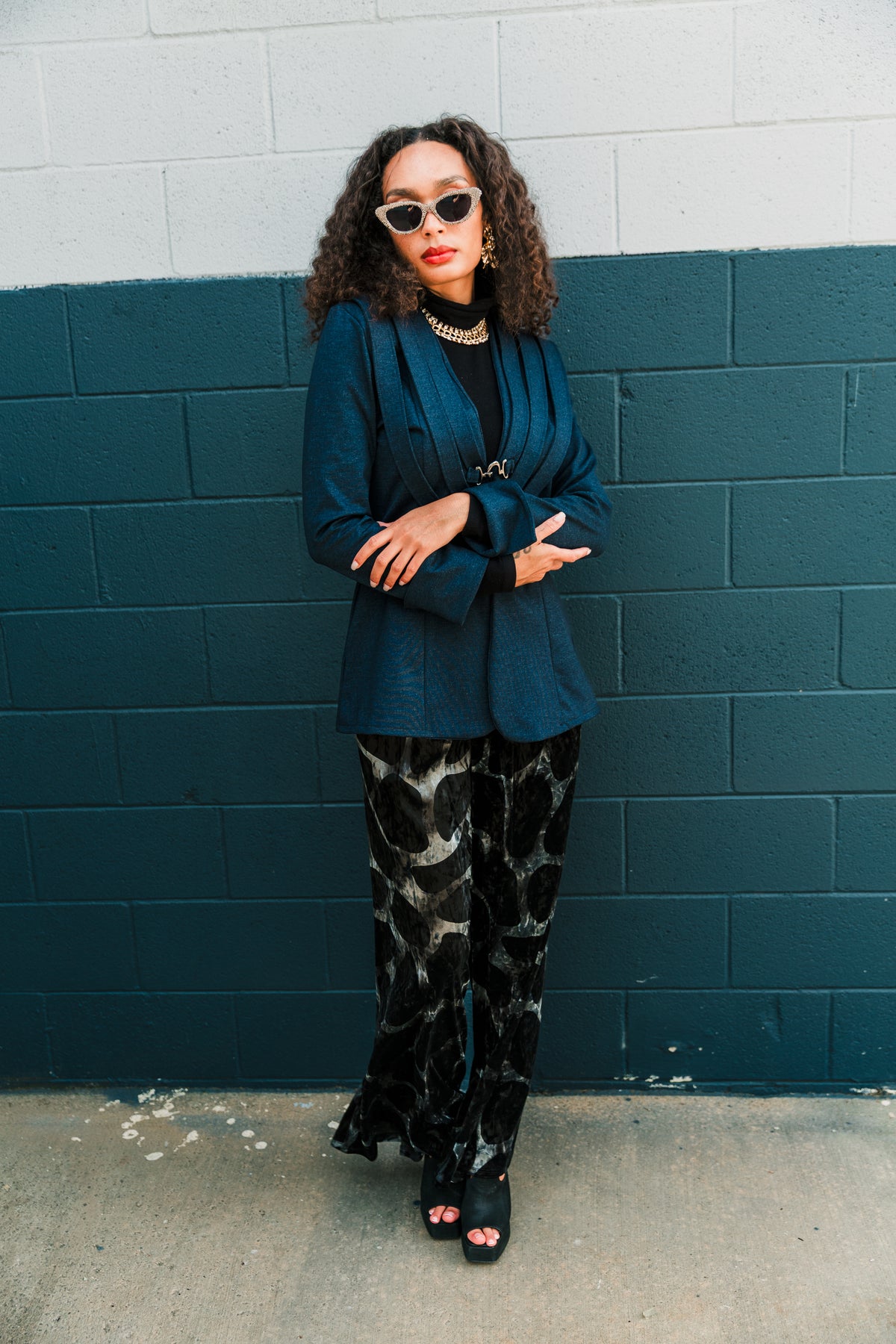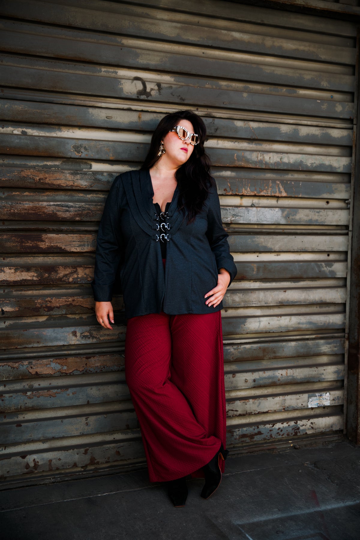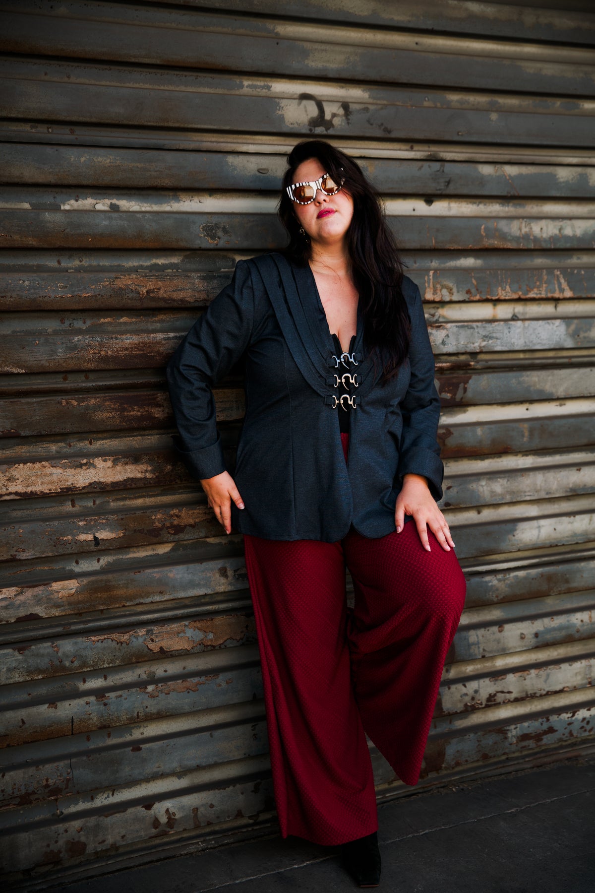 The sartorialist wears a denim-toned ponte blazer that feels equal parts vintage and futuristic. The shoulders are sharp, padded with intention, while strips of fabric frame the lapel like sculptural ribbons. Three hematite closures anchor the front — industrial but elegant, like jewelry repurposed as fastenings. Its unlined body with self-lined lapels reads more architectural than corporate. Our premium ponte knit provides a structured look without losing the comfort of a knit for daily styling. This fabric has excellent recall never losing its shape but, forming to your figure the more it is worn. Paired with wide, fluid pants and retro sunglasses, the look walks the line between tailored power and effortless cool inspired by the designer’s closest fashion confidant and muse Sara Duchovnay.