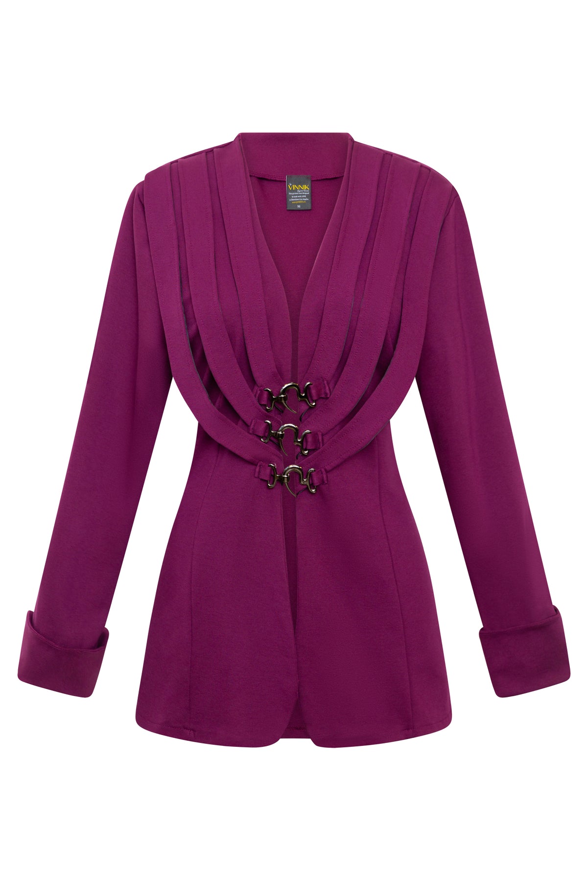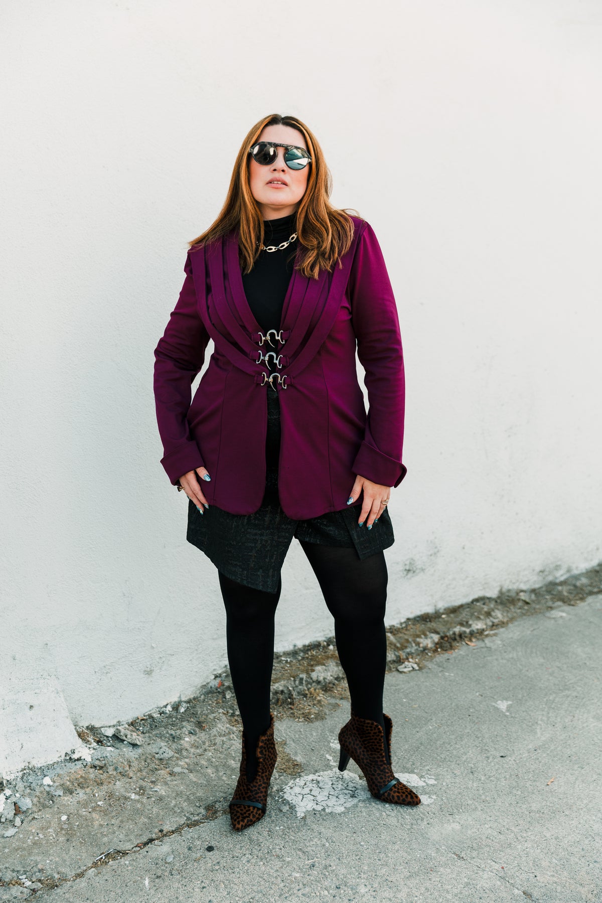 The sartorialist wears a berry-toned ponte blazer that feels equal parts vintage and futuristic. The shoulders are sharp, padded with intention, while strips of fabric frame the lapel like sculptural ribbons. Three hematite closures anchor the front — industrial but elegant, like jewelry repurposed as fastenings. Its unlined body with self-lined lapels reads more architectural than corporate. Our premium ponte knit provides a structured look without losing the comfort of a knit for daily styling. This fabric has excellent recall never losing its shape but, forming to your figure the more it is worn. Paired with wide, fluid pants and retro sunglasses, the look walks the line between tailored power and effortless cool inspired by the designer’s closest fashion confidant and muse Sara Duchovnay.