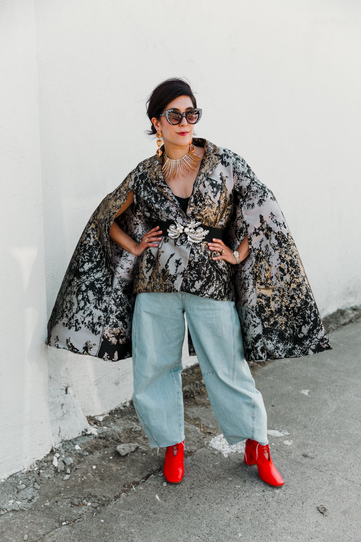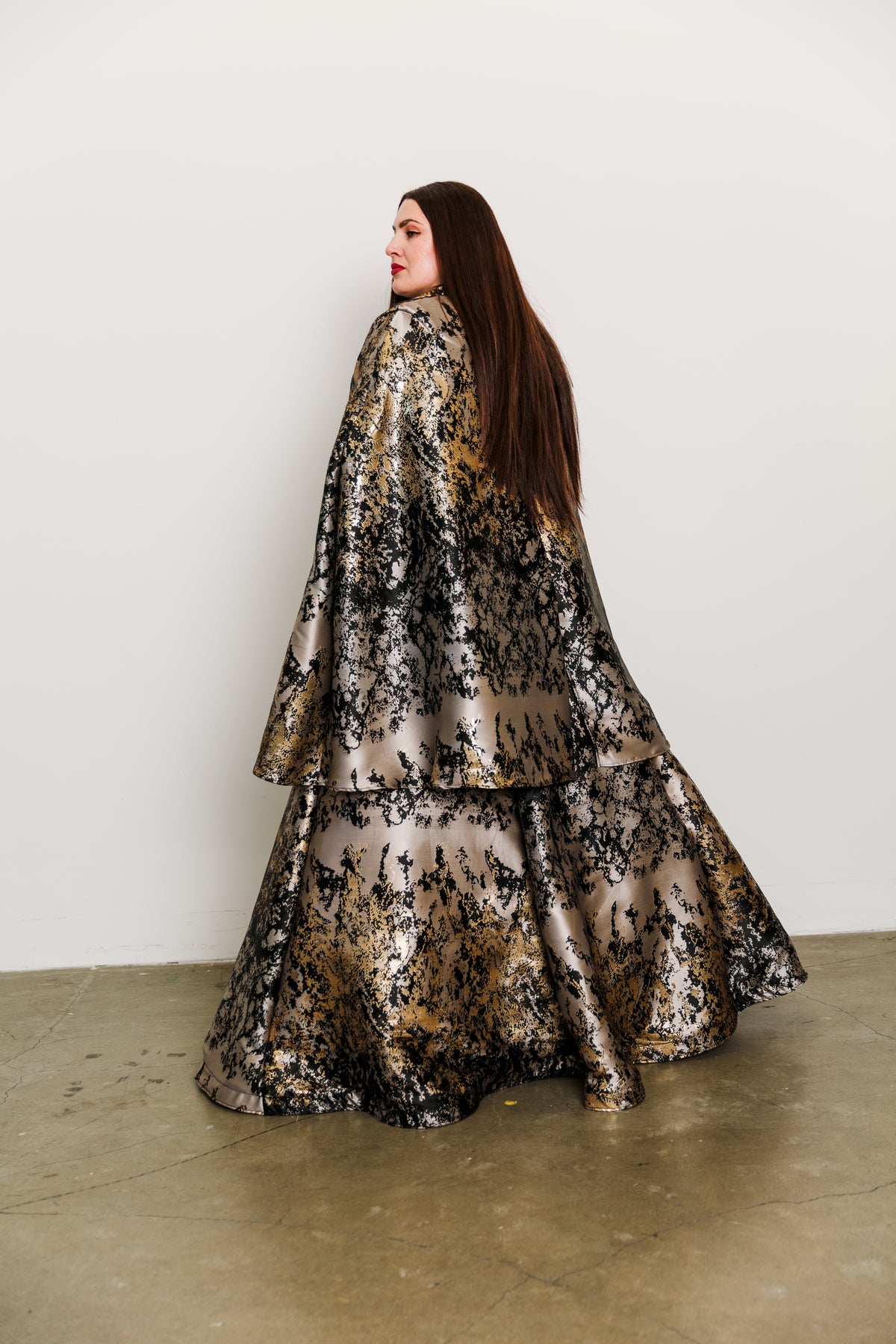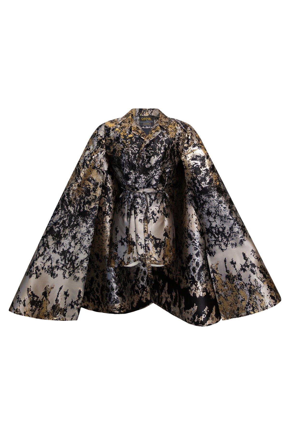 It’s a cape, it’s a jacket—it’s pure drama. Crafted from luxurious deadstock jacquard with a satin lining, this byVINNIK statement piece features an attached cape and matching belt for versatile styling. Whether belted for shape or left open for flow, the Jape guarantees you’ll turn every outing into a grand entrance.