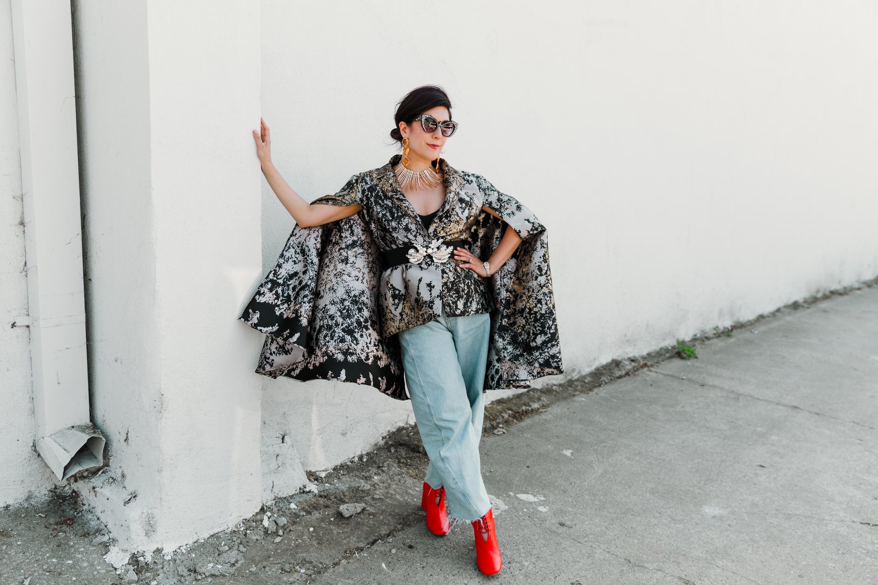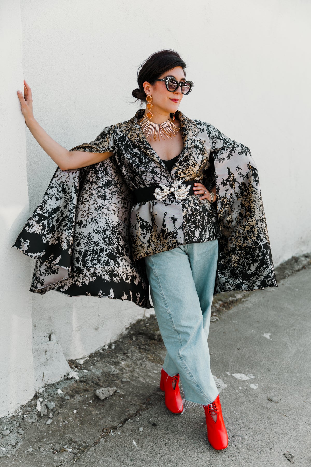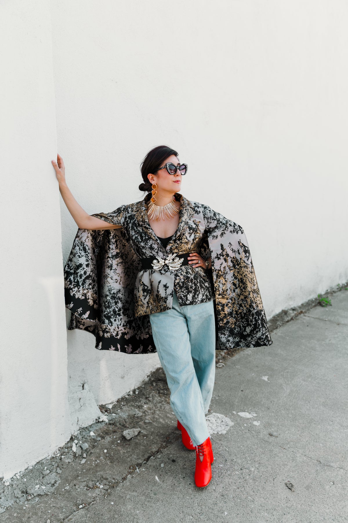 It’s a cape, it’s a jacket—it’s pure drama. Crafted from luxurious deadstock jacquard with a satin lining, this byVINNIK statement piece features an attached cape and matching belt for versatile styling. Whether belted for shape or left open for flow, the Jape guarantees you’ll turn every outing into a grand entrance.