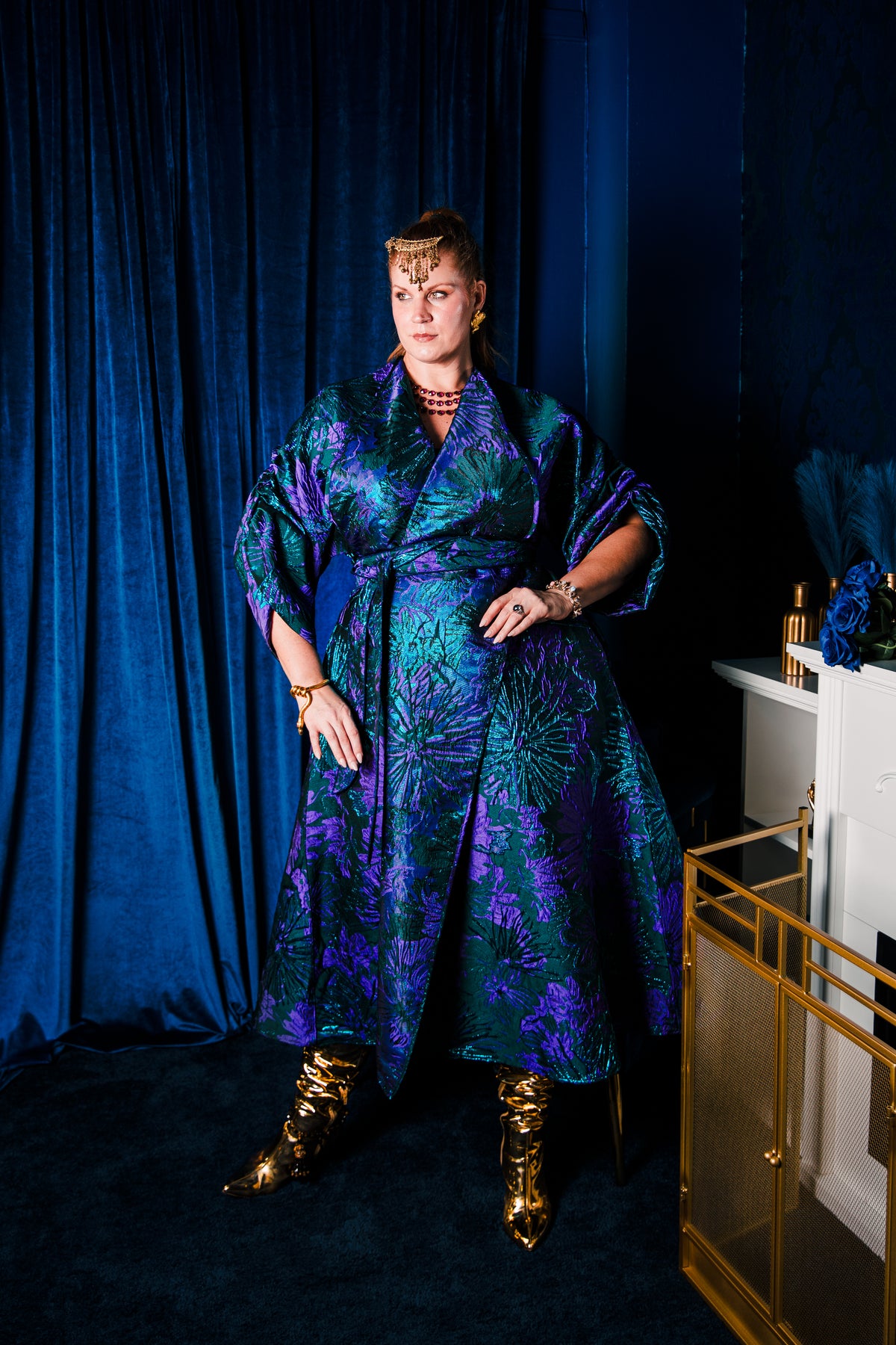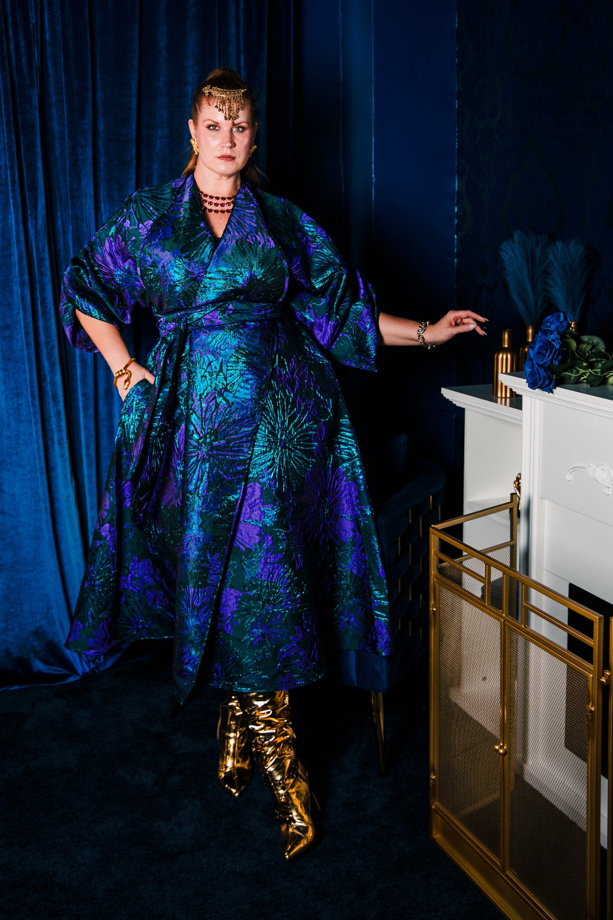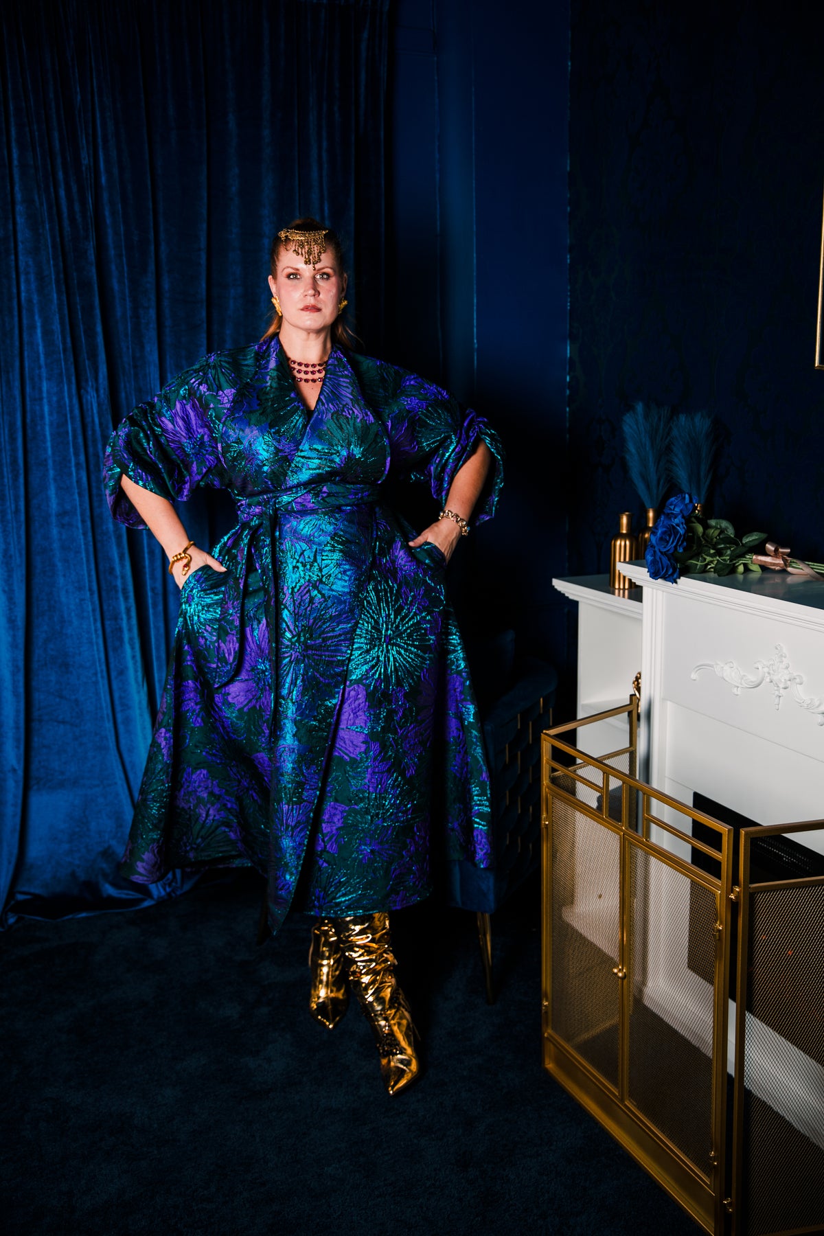 Our iconic Parisian Coat is perfect for being seen at a black tie affair or lounging on your fainting couch in the comfort of your home. We've seen divas pair them with their favorite fashion sneakers, worn open with the belt tied at the waist, over gowns, to the store, and on red carpets. You'll love the wide lapels with the deliciously decadent ruched sleeve. This design was inspired by Parisian couture made in our elaborately rich jacquards. Live out your fantasy in this show-stopping coat exclusive to byVINNIK.