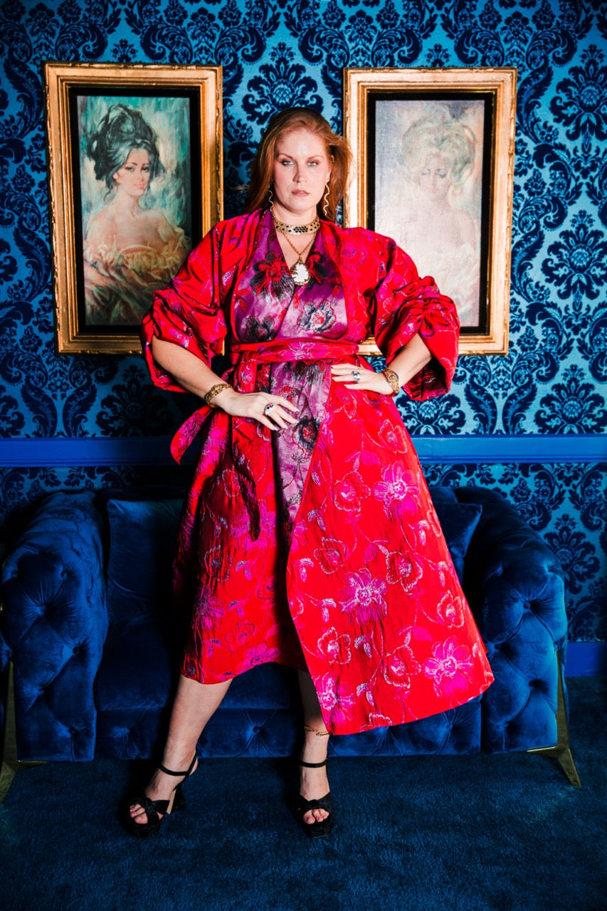 This is our signature best-selling silhouette: the Parisian Coat. Designed with dramatic wide lapels that can be worn open, tucked under, or drawn across and secured with a brooch, it offers exceptional versatility. The elegant ruched sleeves add a refined, sculptural touch, while the option to wear it open or cinched with the belt creates effortless styling possibilities. Finished with discreet side slip pockets, it moves seamlessly between categories—coat, dress, robe, and statement piece all at once.