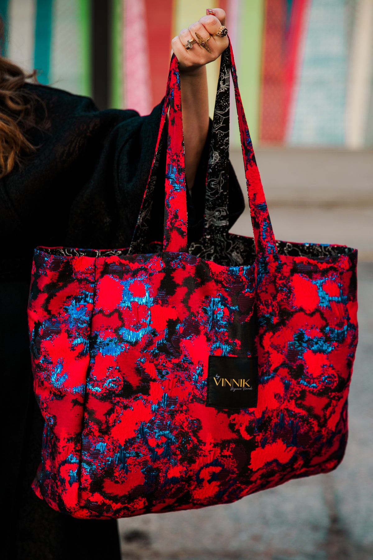 Double the style, double the function. This Flip Side Tote Bag is thoughtfully designed for versatility and sustainability. Yes, it is REVERSIBLE! One side features a luxurious premium jacquard for a refined, elevated look, while the reverse reveals a playful novelty cotton print—perfect for when you want to show off your fun side. It is oversized. It is fun!