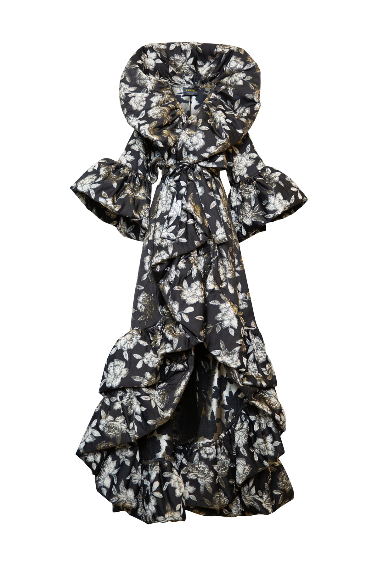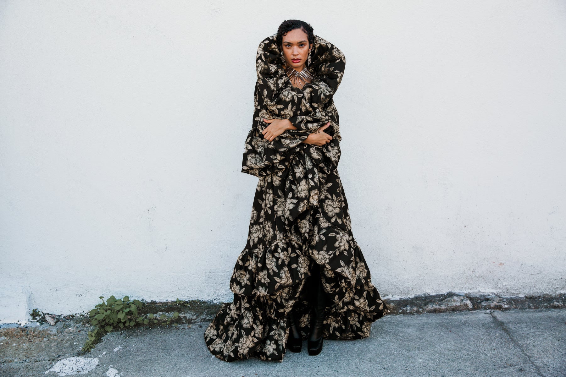 Pure byVINNIK drama. This one-of-a-kind Double Manhattan Opera Coat features two tiers of sculptural ruffles that can stand tall or fold down thanks to the interior crinoline. Designed with an attached sash tie, hidden pockets, and a floor-sweeping hem, it’s made for bold entrances and effortless glamour. Handcrafted in our LA Atelier