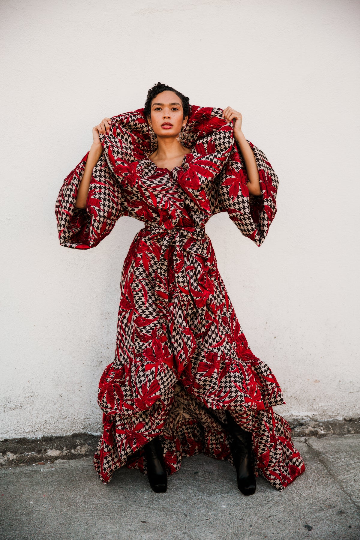 Pure byVINNIK drama. This one-of-a-kind Double Manhattan Opera Coat features two tiers of sculptural ruffles that can stand tall or fold down thanks to the interior crinoline. Designed with an attached sash tie, hidden pockets, and a floor-sweeping hem, it’s made for bold entrances and effortless glamour. Handcrafted in our LA Atelier